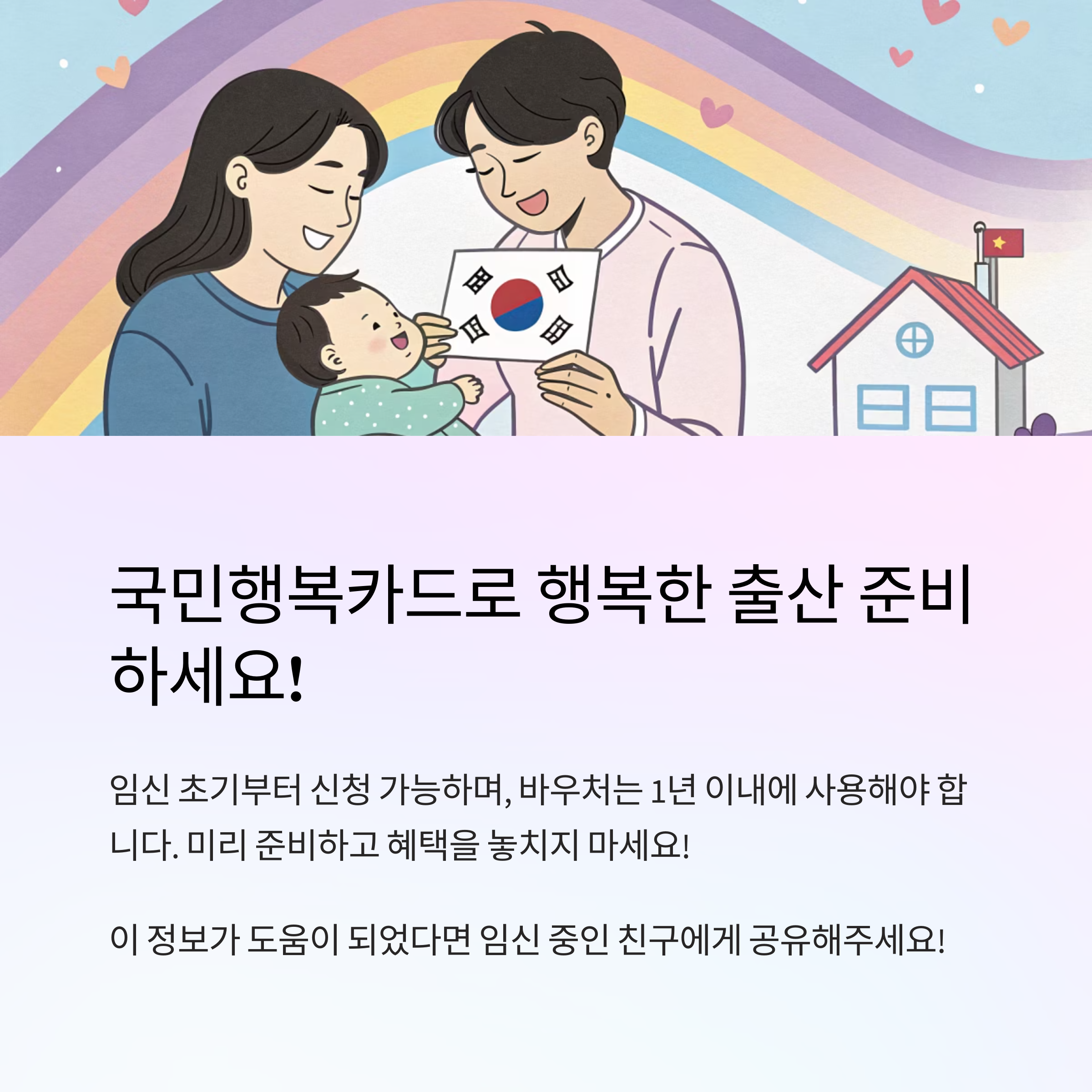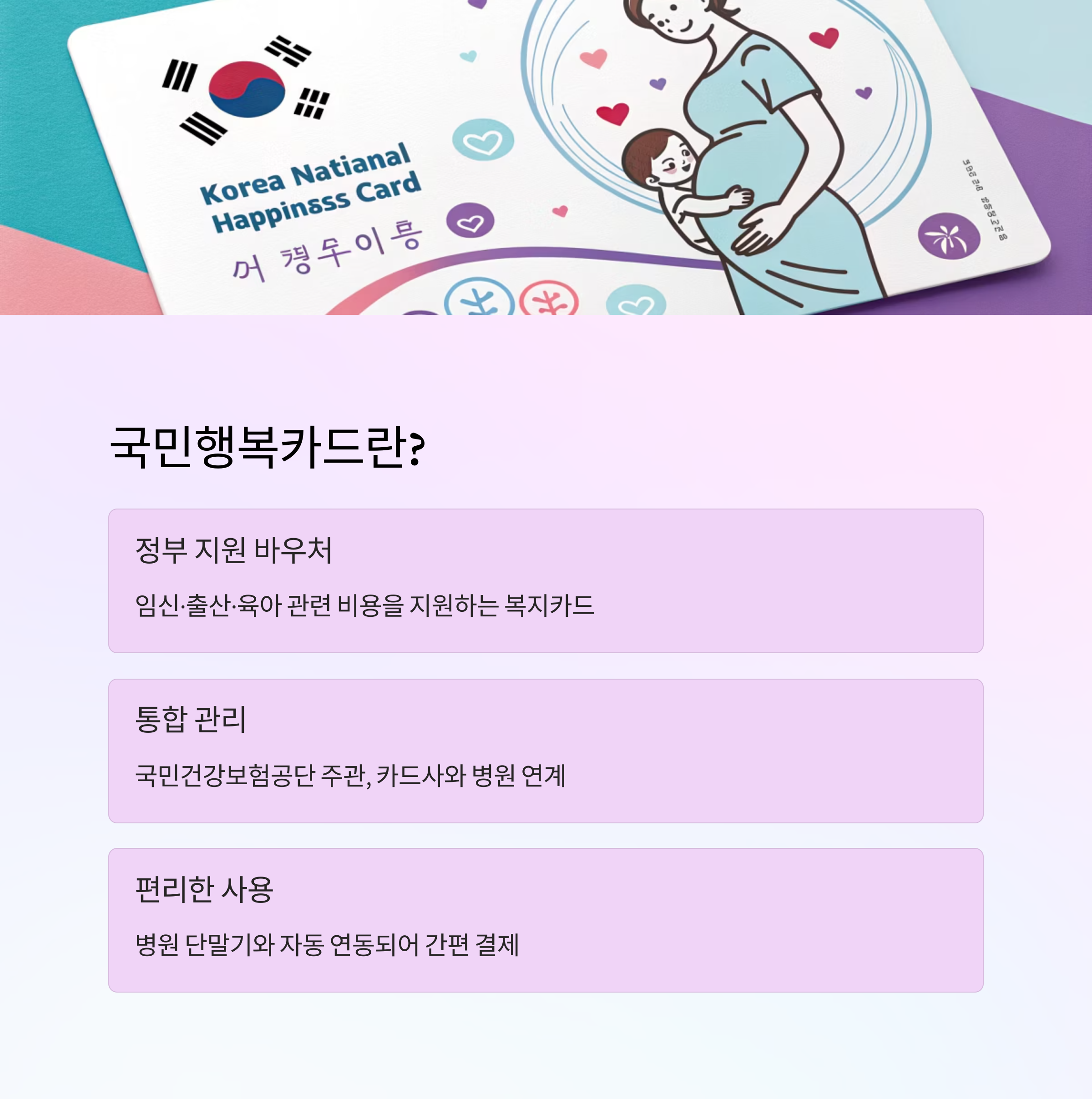 국민행복카드는 정부에서 지원하는 복지 바우처 카드예요. 주로 임신·출산 관련한 지원을 받을 수 있는 카드로, 산모의 건강한 출산과 아이의 건강한 성장을 돕기 위해 만들어졌어요. 이 카드 하나면 임신부터 출산, 육아까지 다양한 시점에서 필요한 의료서비스나 지원금을 받을 수 있어요.