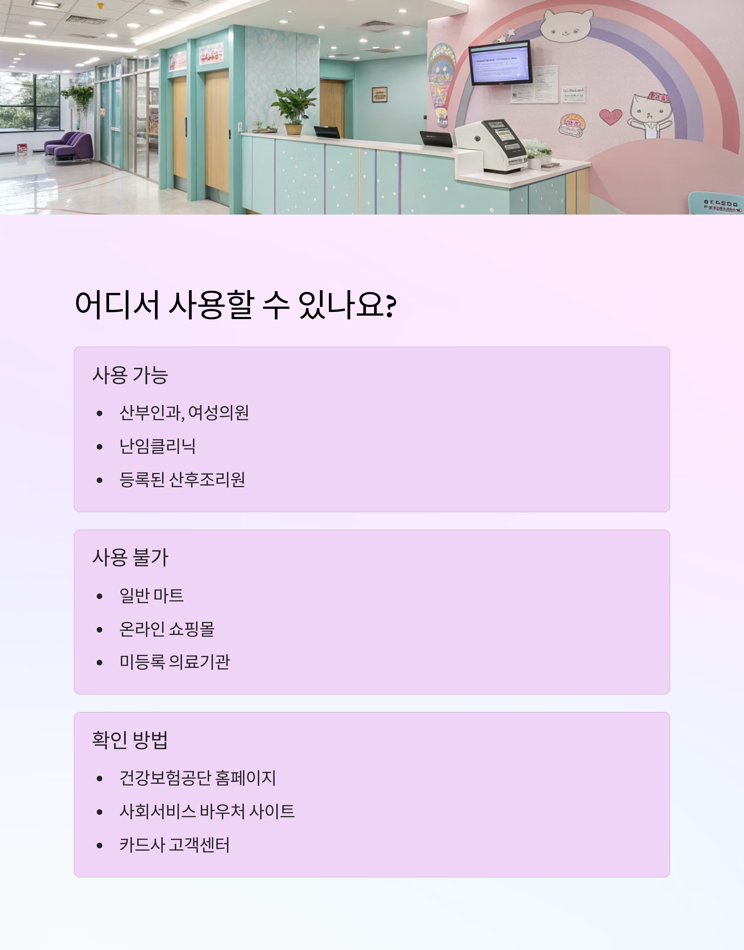 카드가 발급됐다고 해서 아무 데서나 쓸 수 있는 건 아니에요. 꼭 등록된 병원이나 조리원인지 확인한 후 사용해야 헛걸음하지 않아요!