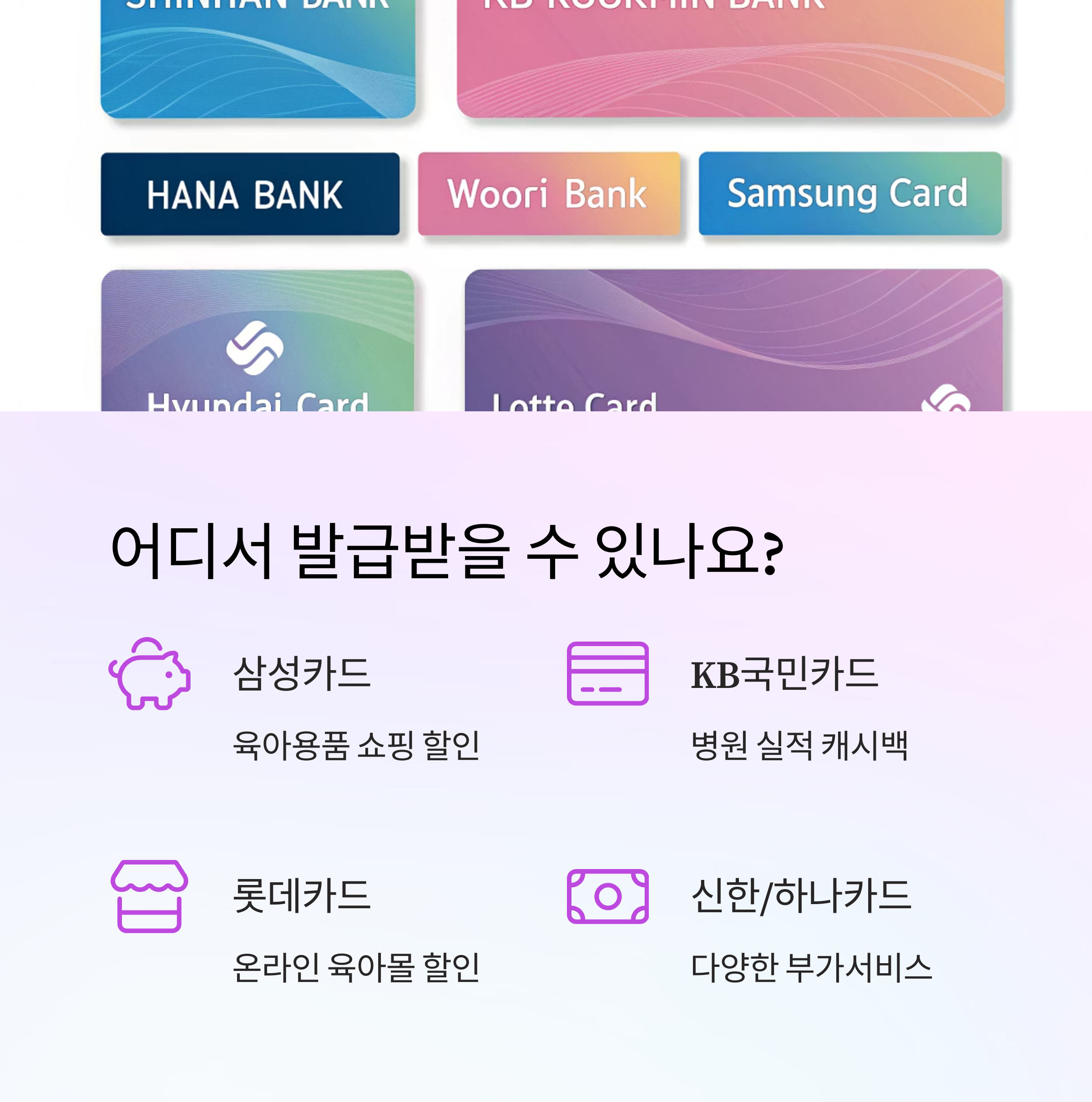 병원이나 산부인과에 따라 협약된 카드사가 있는 경우도 있어서, 주치의 병원에 확인해보는 것도 좋아요. 해당 카드사가 아닌 경우 사용이 제한될 수도 있으니 발급 전 체크가 필요해요.