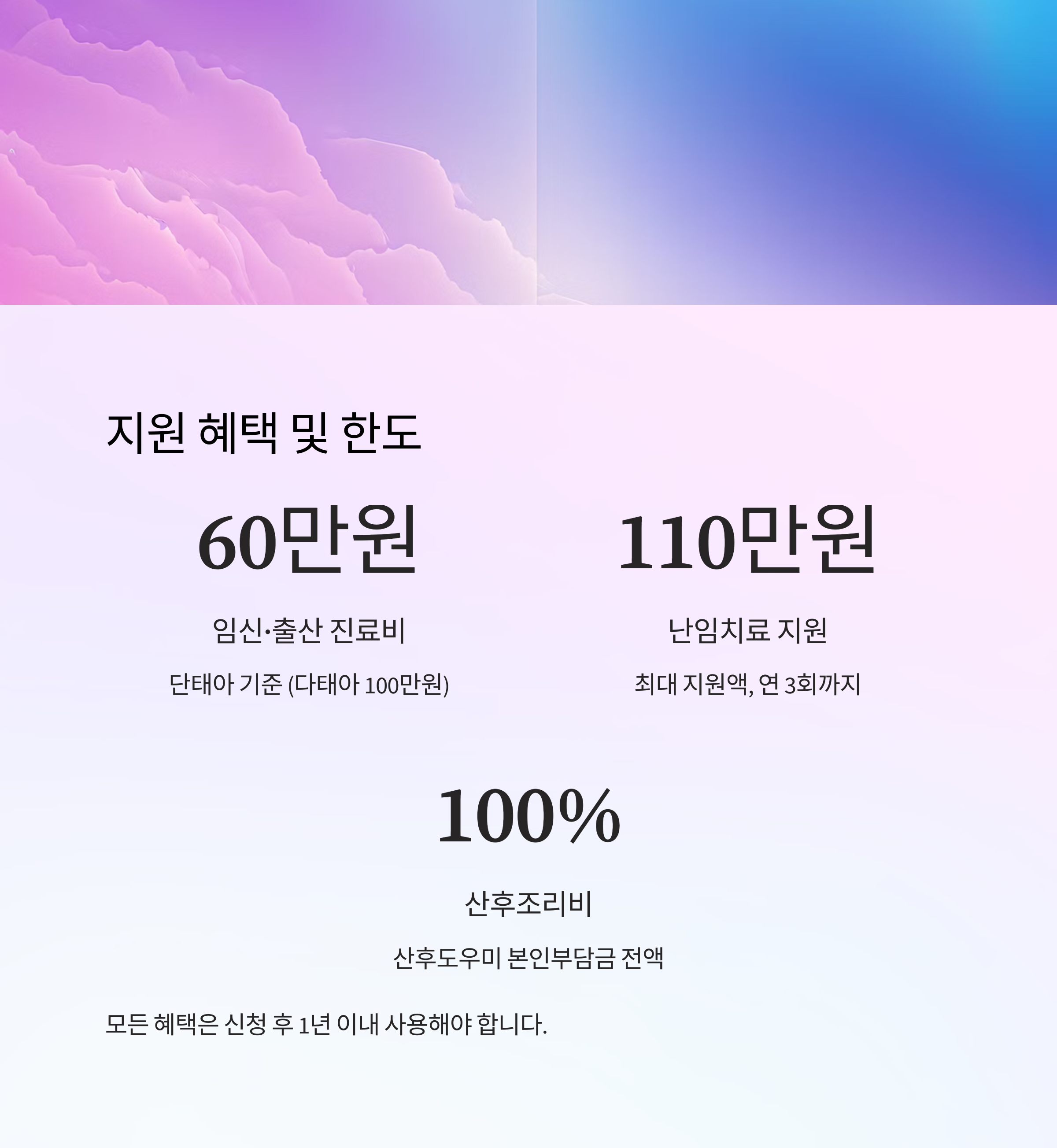 | 난임 시술비 | 인공수정/체외수정 | 최대 110만원 | 횟수 제한 있음 |