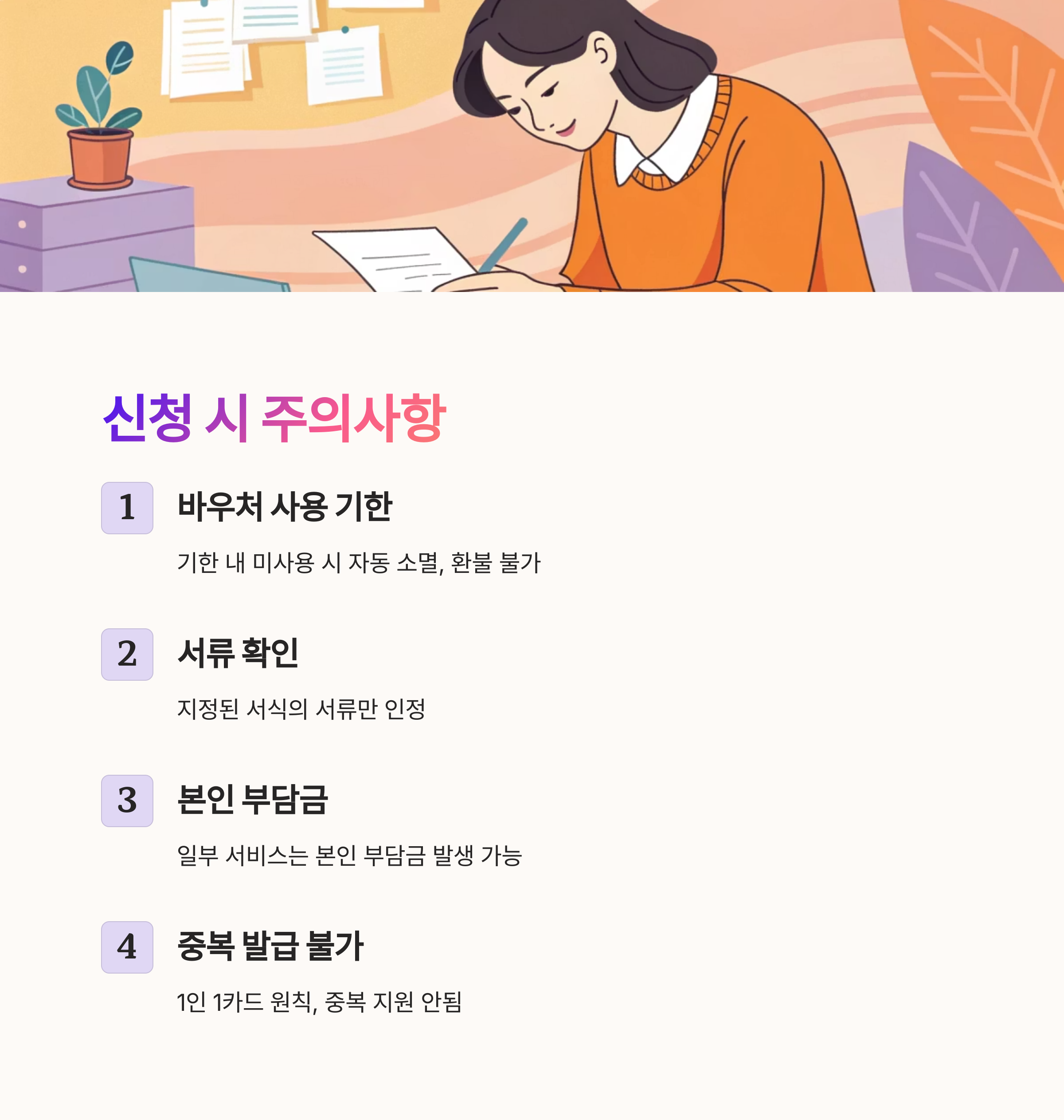 국민행복카드는 복지성격이 강한 카드인 만큼 신청 시 몇 가지 유의사항이 있어요. 가장 중요한 건 ‘바우처 사용 기한’을 반드시 지켜야 한다는 점이에요. 바우처는 대부분 신청일 기준으로 사용기한이 정해지며, 그 기한을 넘기면 자동으로 소멸되기 때문에 유효기간을 꼼꼼히 확인해야 해요.