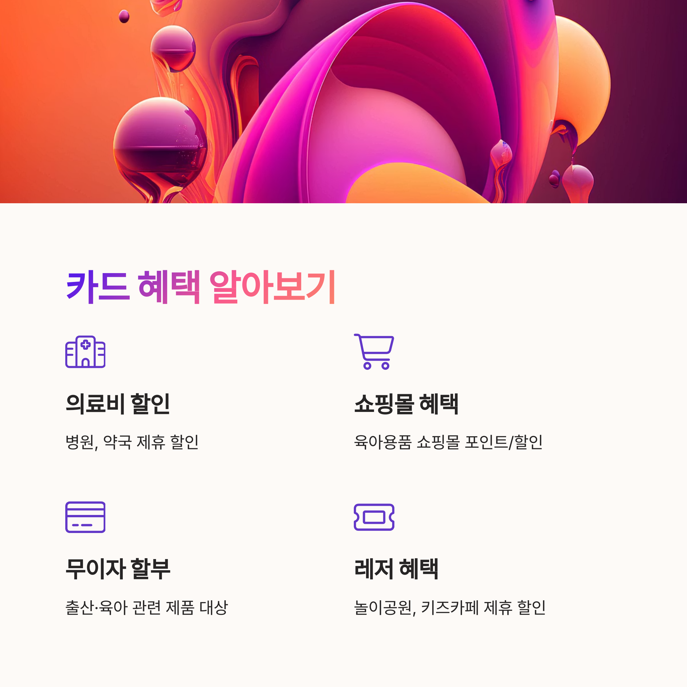 국민행복카드는 정부 지원금 사용뿐 아니라 카드사별 추가 혜택도 꽤 풍부한 편이에요. 단순한 바우처 수단이 아니라, 일상생활에서도 활용할 수 있는 기능이 많기 때문에 제대로 활용하면 육아 가계부에 큰 도움이 된답니다. 특히 임신·출산 초기 지출이 많은 시기에 실질적인 할인 혜택을 누릴 수 있어요.