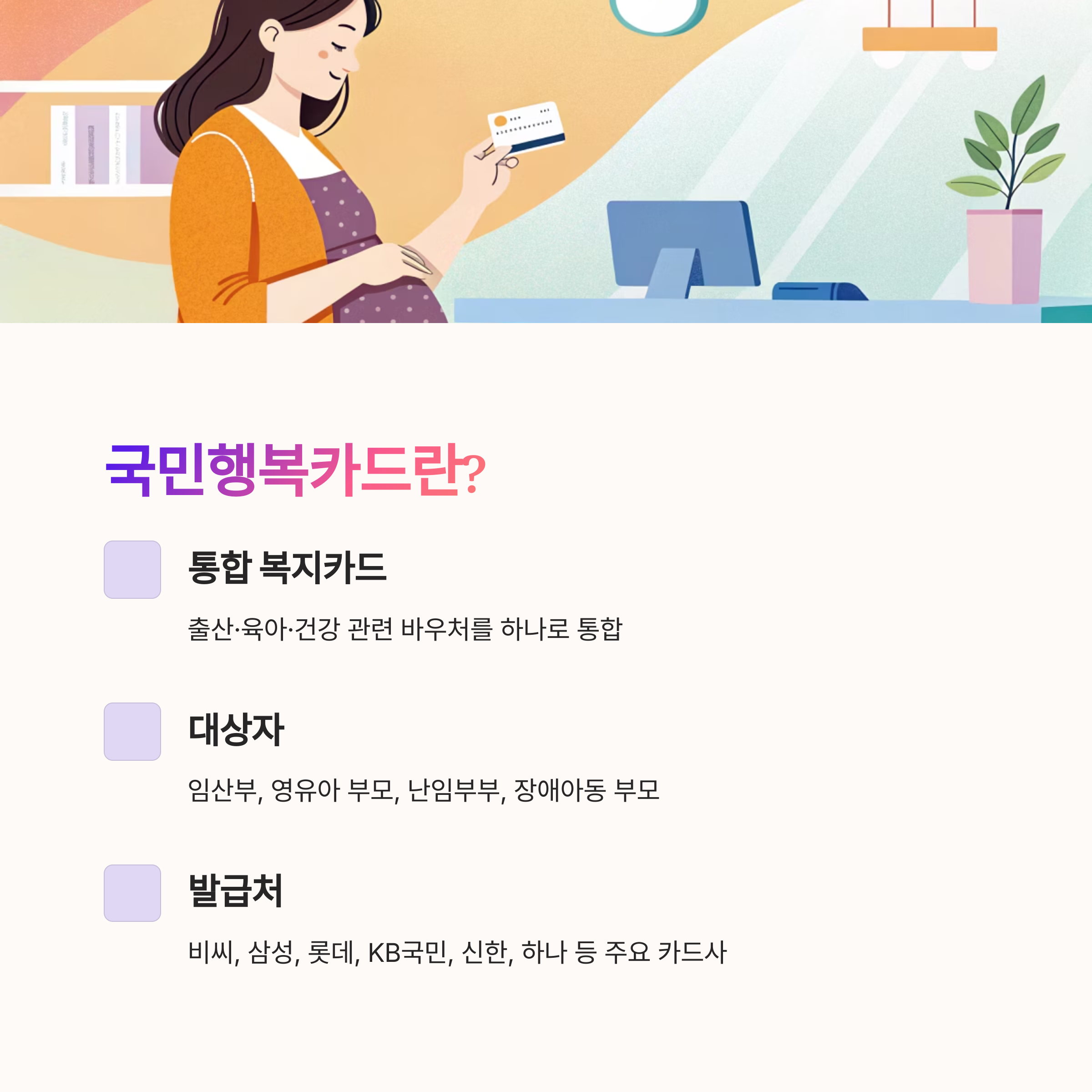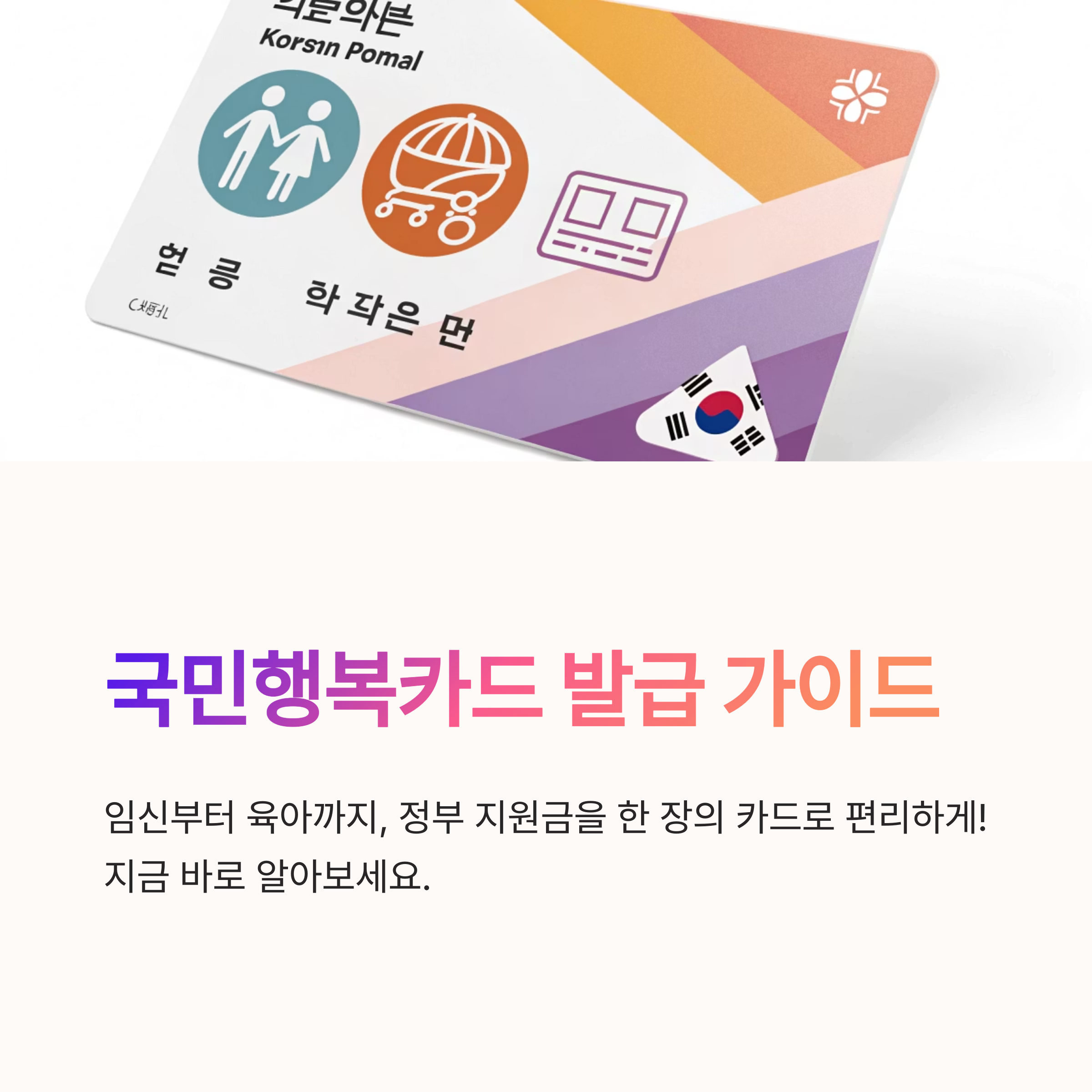 국민행복카드는 정부가 지원하는 다양한 출산·육아·건강 관련 바우처를 통합적으로 사용할 수 있게 해주는 복지카드예요. 주로 임산부, 영유아 보호자, 난임부부, 장애인 부모 등을 위해 설계되었고, 이 카드 하나로 각종 바우처를 간편하게 사용할 수 있답니다. 기존에는 다양한 복지서비스마다 각각 다른 카드가 필요했지만, 국민행복카드는 그것을 하나로 통합해서 훨씬 효율적으로 관리할 수 있게 해줘요.