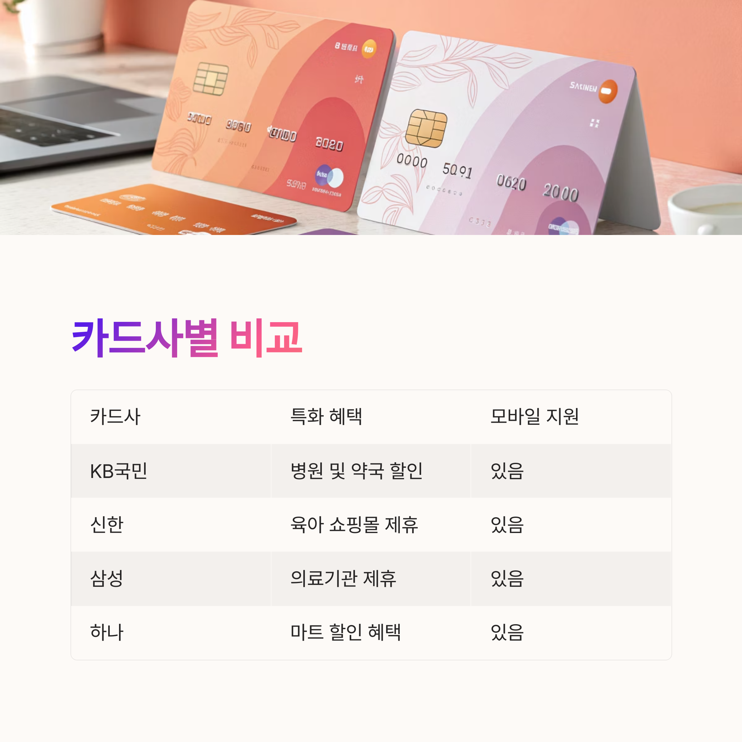 | 카드사 | 신청 방식 | 모바일 지원 | 특화 혜택 |