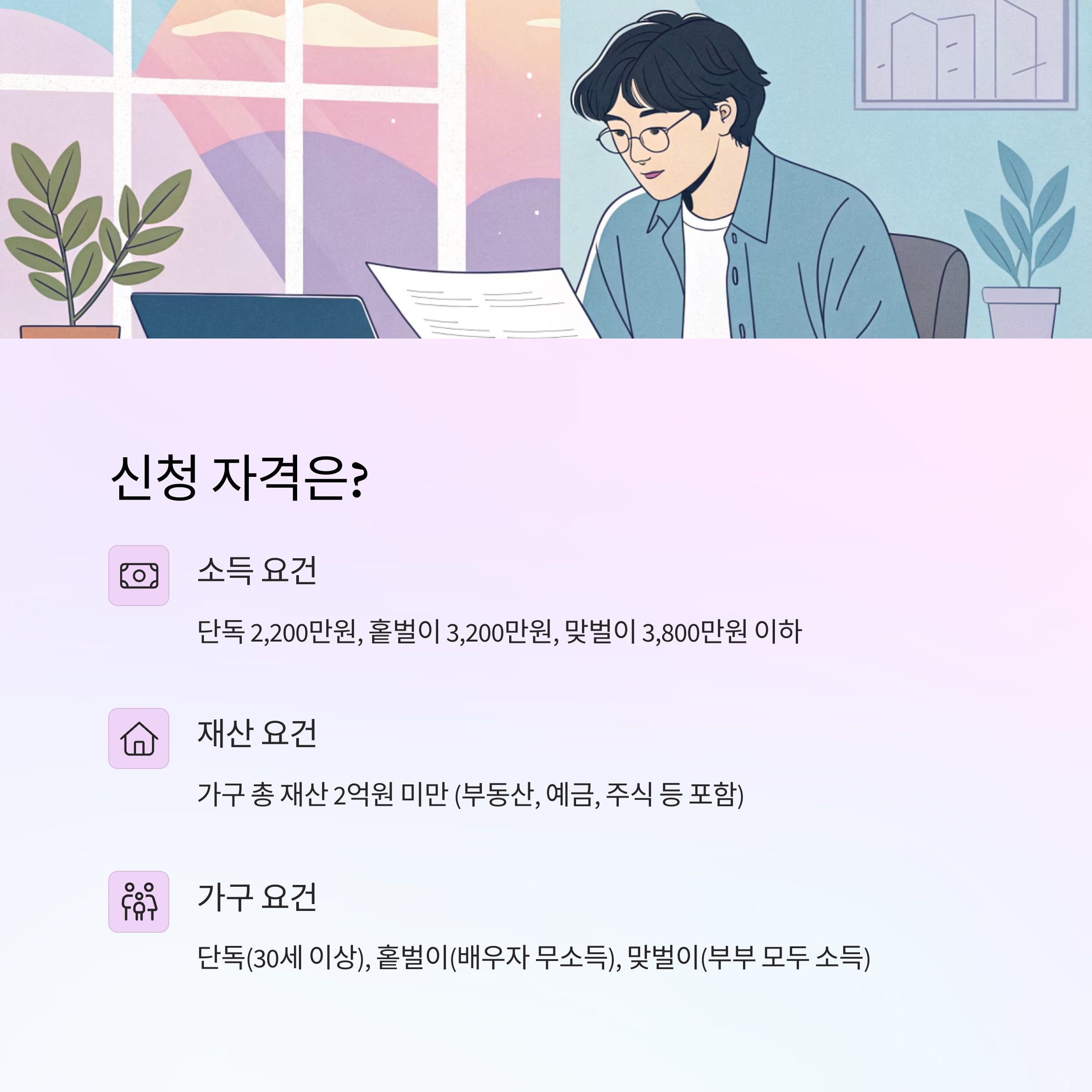 먼저 소득 요건부터 살펴볼게요. 단독 가구는 연간 총소득이 약 2,200만 원 이하, 홑벌이 가구는 3,200만 원 이하, 맞벌이 가구는 3,800만 원 이하인 경우 신청할 수 있어요. 총소득에는 근로소득, 사업소득, 공적연금 소득 등이 모두 포함된답니다.