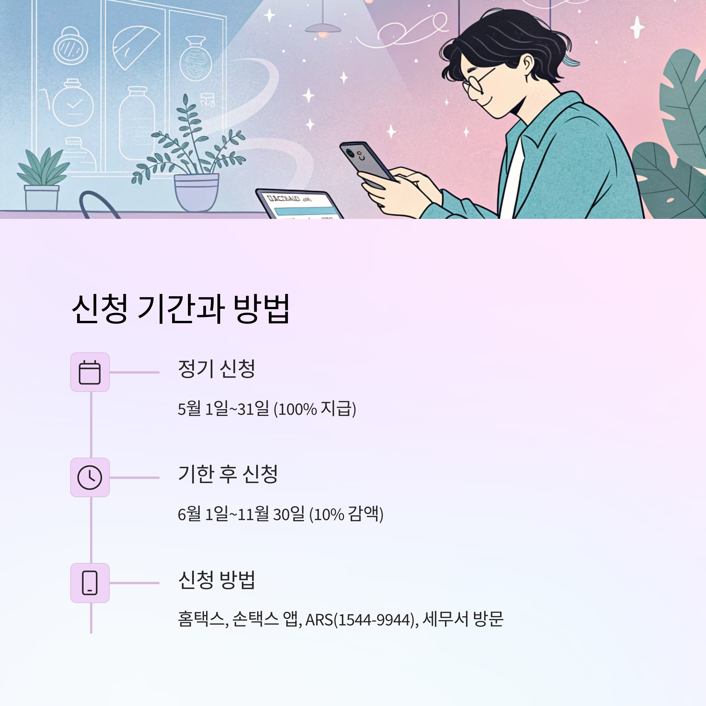 신청은 국세청에서 주관하며, 홈택스, 손택스(모바일 앱), ARS, 세무서 방문 등을 통해 가능해요. 특히 모바일 손택스 앱을 이용하면 본인 인증 후 5분이면 신청이 끝날 만큼 간편하답니다.