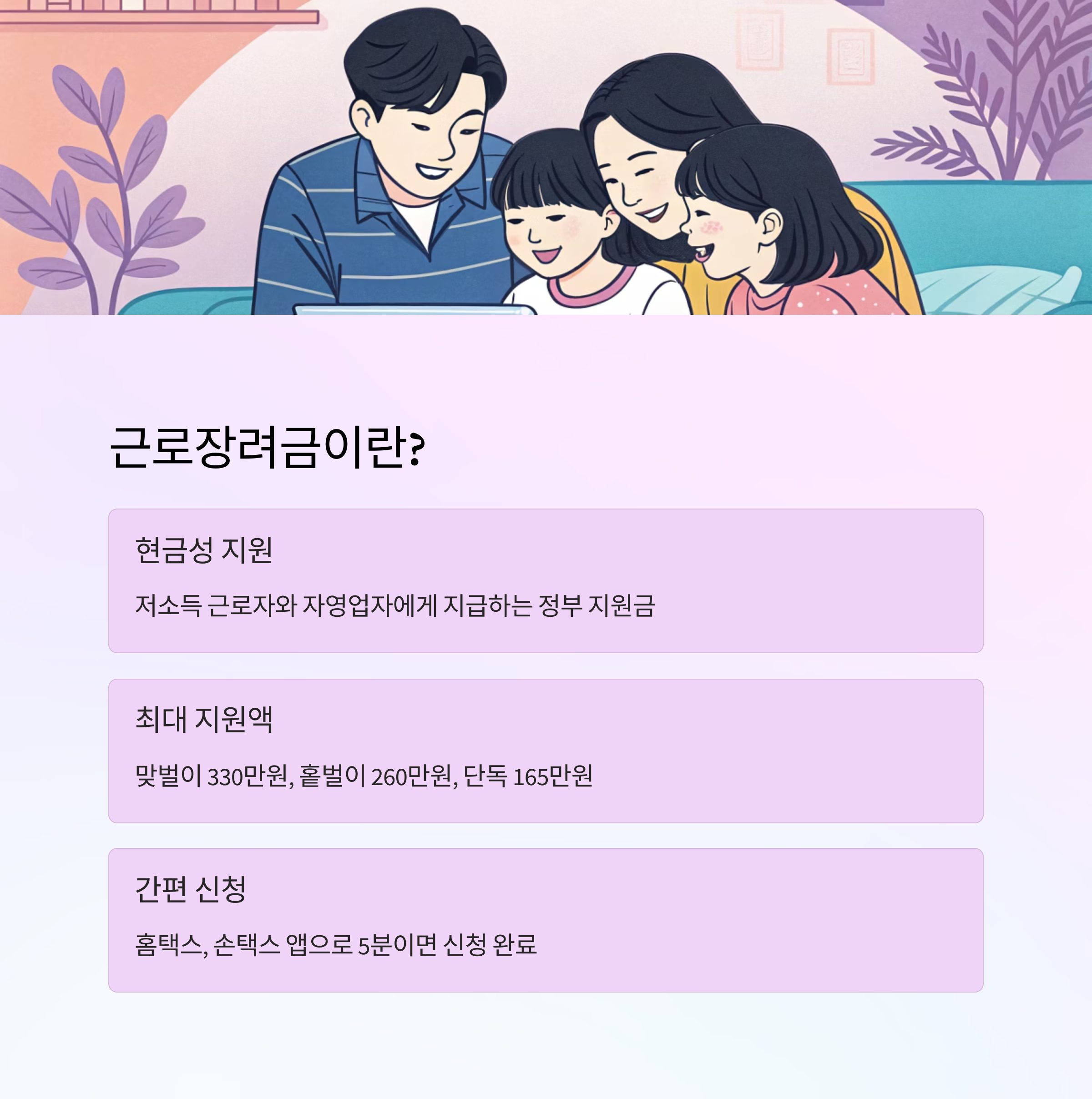 근로장려금 제도는 2009년에 도입되어 매년 확대되고 있어요. 2025년 기준으로는 단독 가구, 홑벌이 가구, 맞벌이 가구로 구분되어 지원 금액이 달라져요. 예를 들어, 맞벌이 가구는 최대 330만 원까지 받을 수 있고, 단독 가구도 최대 165만 원까지 받을 수 있어요.