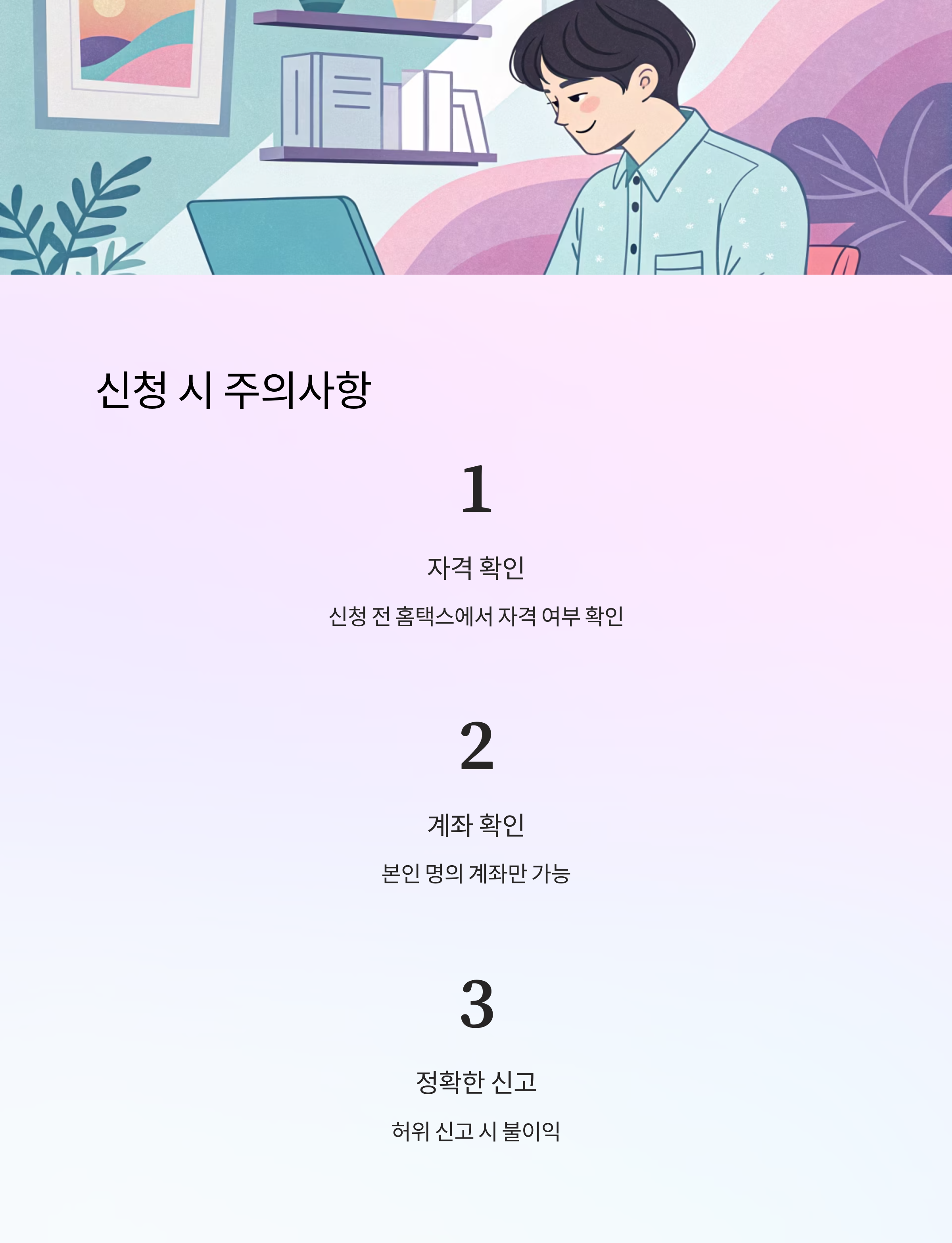 첫째, 신청 전 반드시 국세청 홈택스 또는 손택스에서 '나의 장려금 신청 자격 확인' 메뉴를 이용해서 자격 여부를 미리 확인해보세요. 소득, 재산, 가족 정보가 자동으로 조회되기 때문에 신청 대상인지 바로 알 수 있어요.