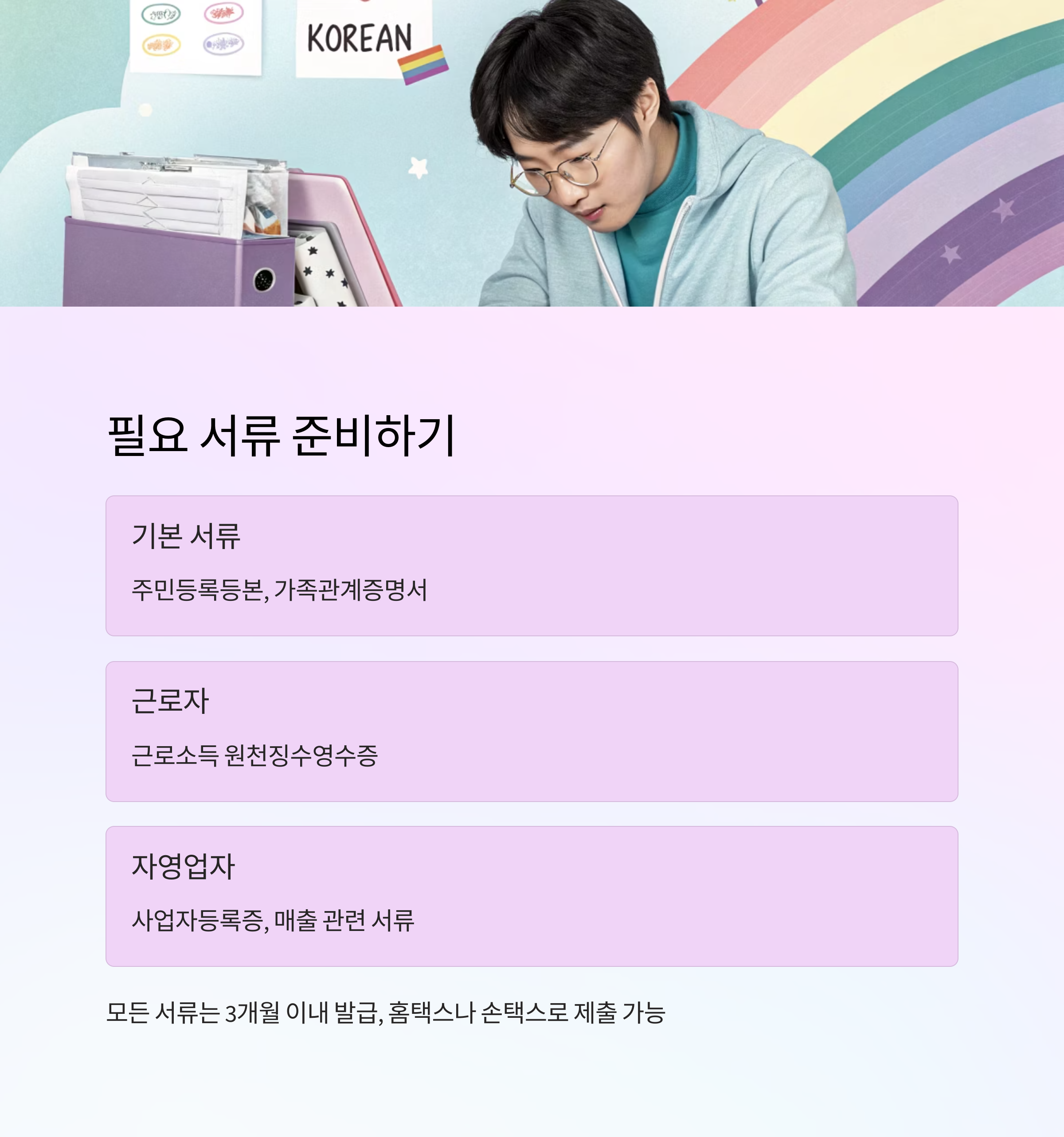 보통은 국세청에서 발송한 '신청안내문'을 받은 경우라면 별도 서류 없이 신청이 가능하지만, 본인이 직접 신청하거나 안내문을 받지 못한 경우라면 본인 소득과 가족관계 등을 증빙할 서류가 필요해요.