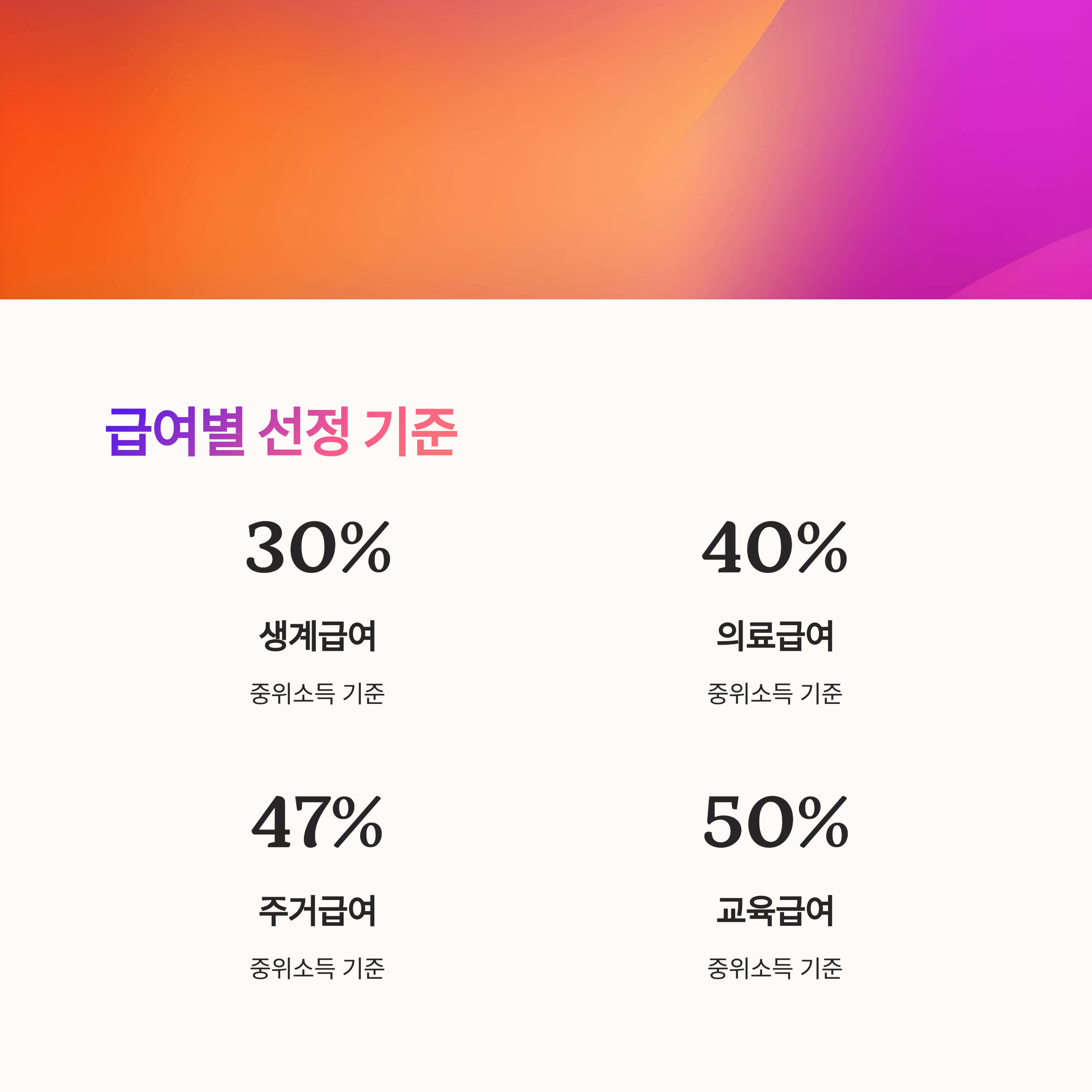 2025년 현재 기준으로는 중위소득을 기준으로 각각의 급여 자격 조건이 정해져 있어요. 예를 들어, 생계급여는 기준 중위소득의 30% 이하, 의료급여는 40%, 주거급여는 47%, 교육급여는 50% 이하일 때 가능해요.