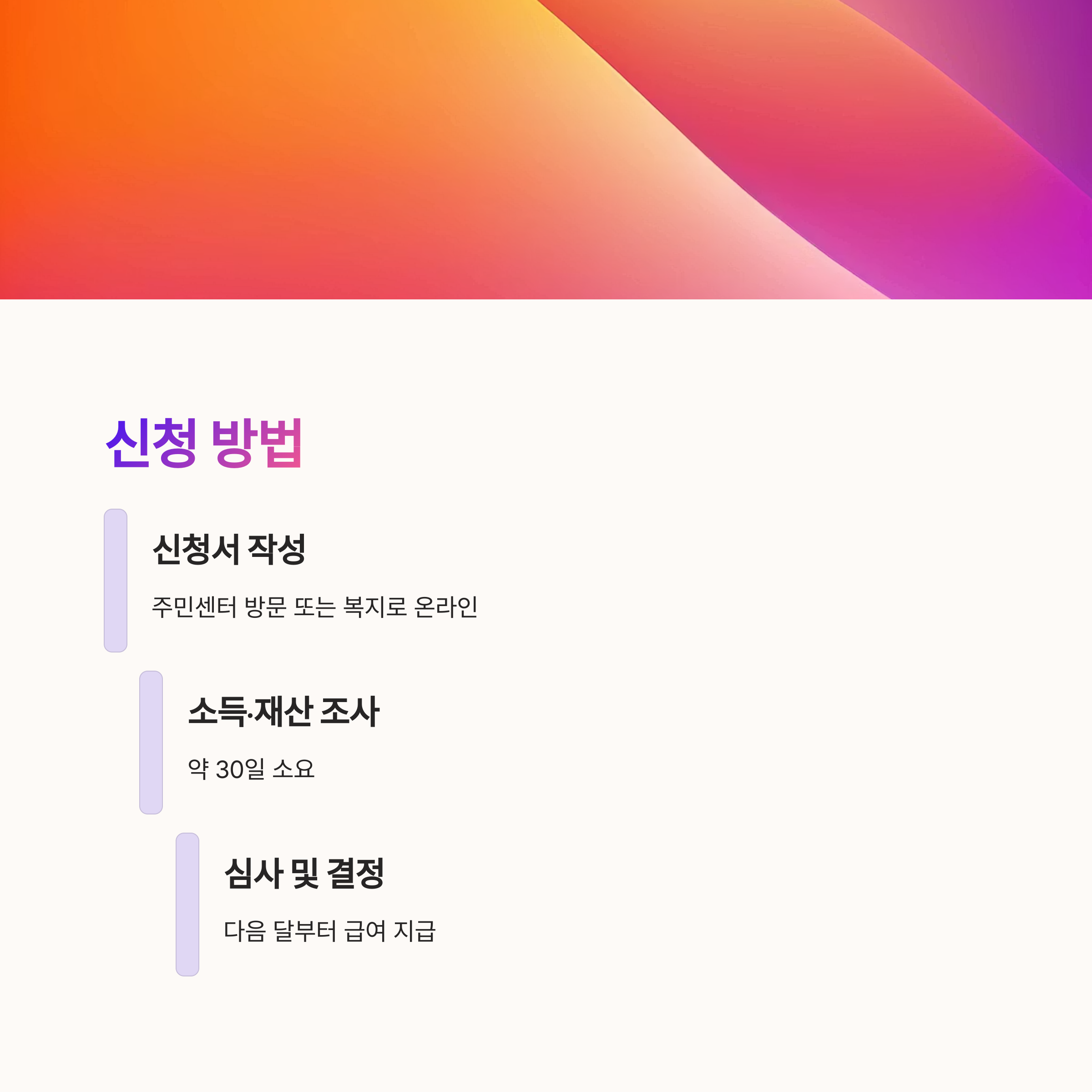 신청 이후에는 관할 지자체에서 ‘소득·재산 조사’가 진행돼요. 이때 건강보험료 납부 내역, 통장 거래내역, 부동산 및 차량 소유 여부까지 전부 조회되기 때문에 사실대로 작성하는 것이 중요해요. 허위 기재는 수급 탈락이나 불이익이 될 수 있어요.