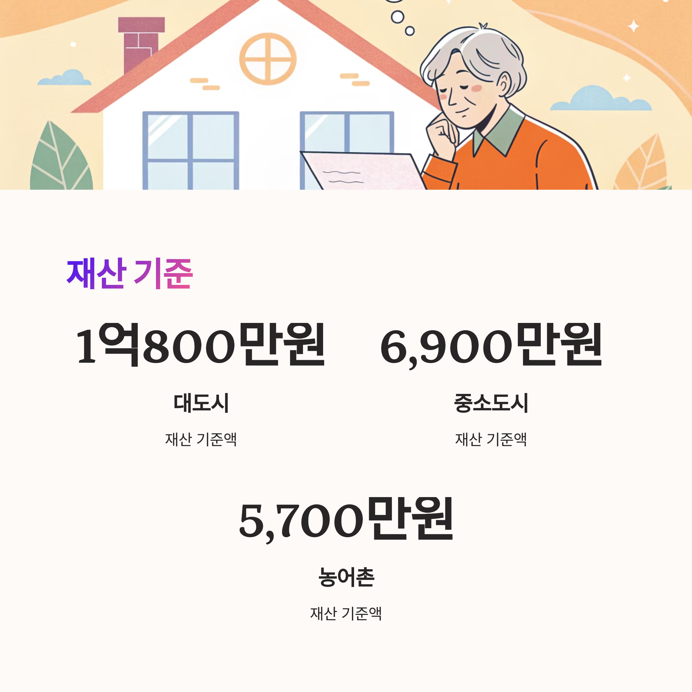 2025년 기준, 일반재산은 대도시 기준 약 1억 800만 원, 중소도시는 6,900만 원, 농어촌은 5,700만 원 이하일 경우 수급 가능성이 있어요. 이 범위를 넘으면 수급 탈락 사유가 되기도 해요.