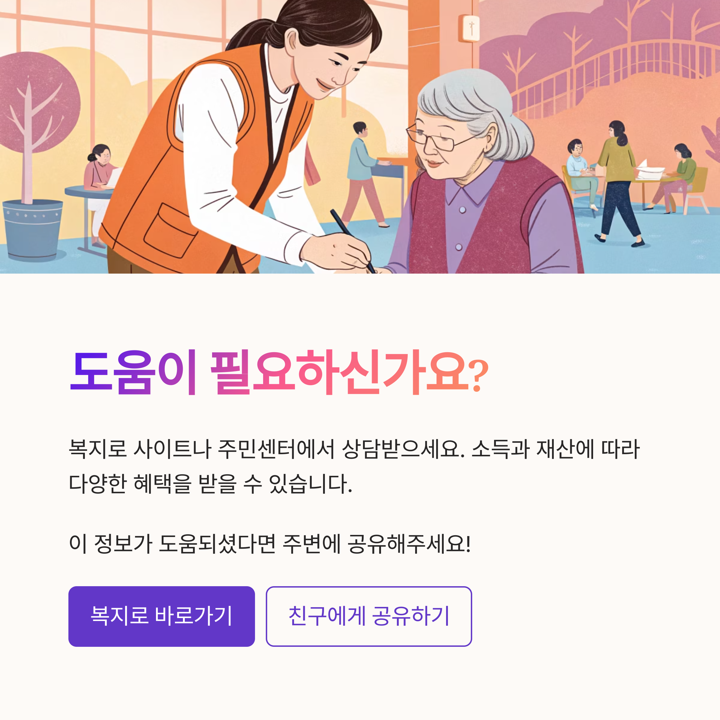 이처럼 재산은 종류와 상황에 따라 유연하게 적용돼요. 단순히 집이 있거나 차가 있다고 무조건 수급 불가가 아니라, 쓰임새와 생계여부를 기준으로 판단되기 때문에 주민센터에 꼭 문의해보는 걸 추천해요! 😊