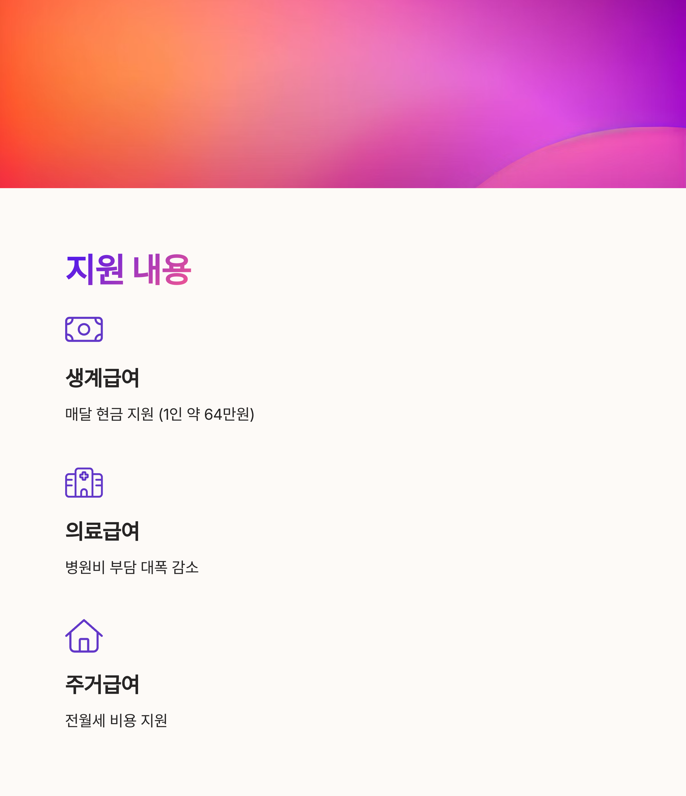 | 생계급여 | 월별 현금 지원 | 통장 입금 |