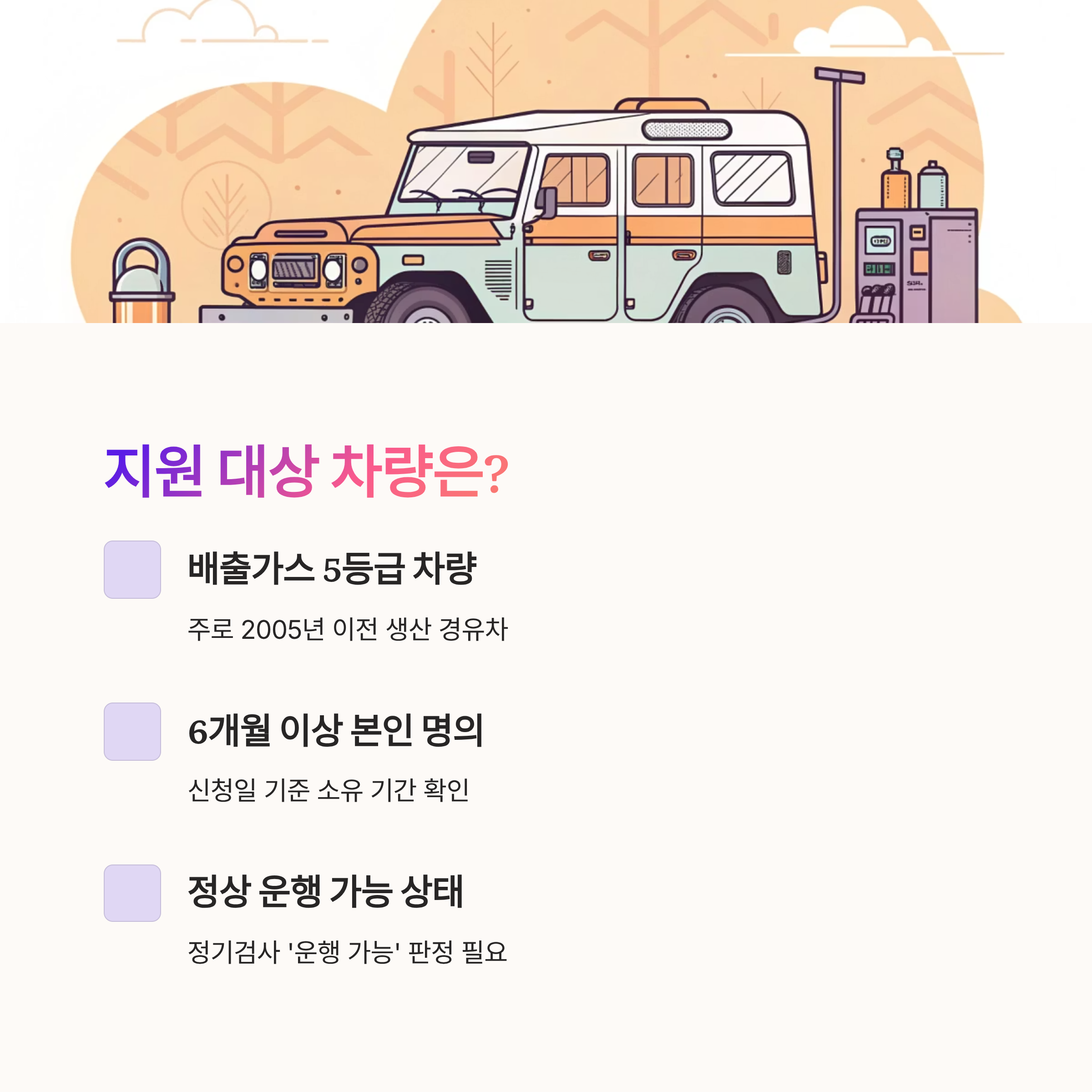 Q1. 노후차량 폐차 지원금은 어떤 차량이 받을 수 있나요?