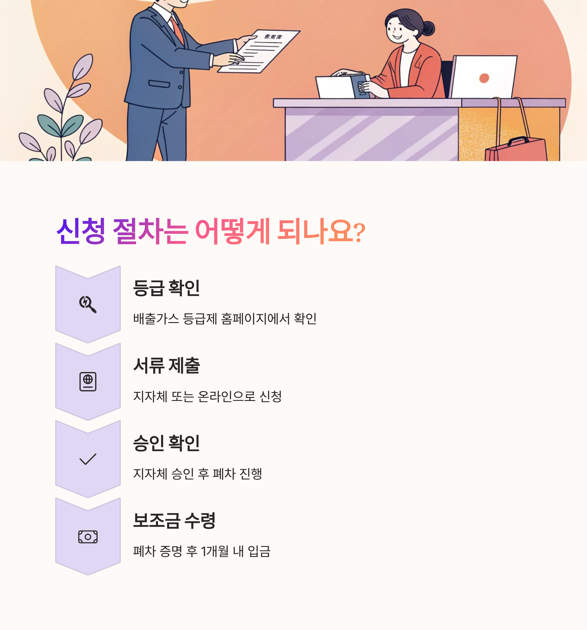 서류를 제출하고 신청이 완료되면, 지자체 담당 부서에서 검토 후 지원 대상 여부를 통보해줘요. 통보 후 폐차를 진행하고, 해당 서류를 다시 제출하면 보조금이 지급돼요. 전체 절차는 약 1~2개월 정도 소요돼요. 📆