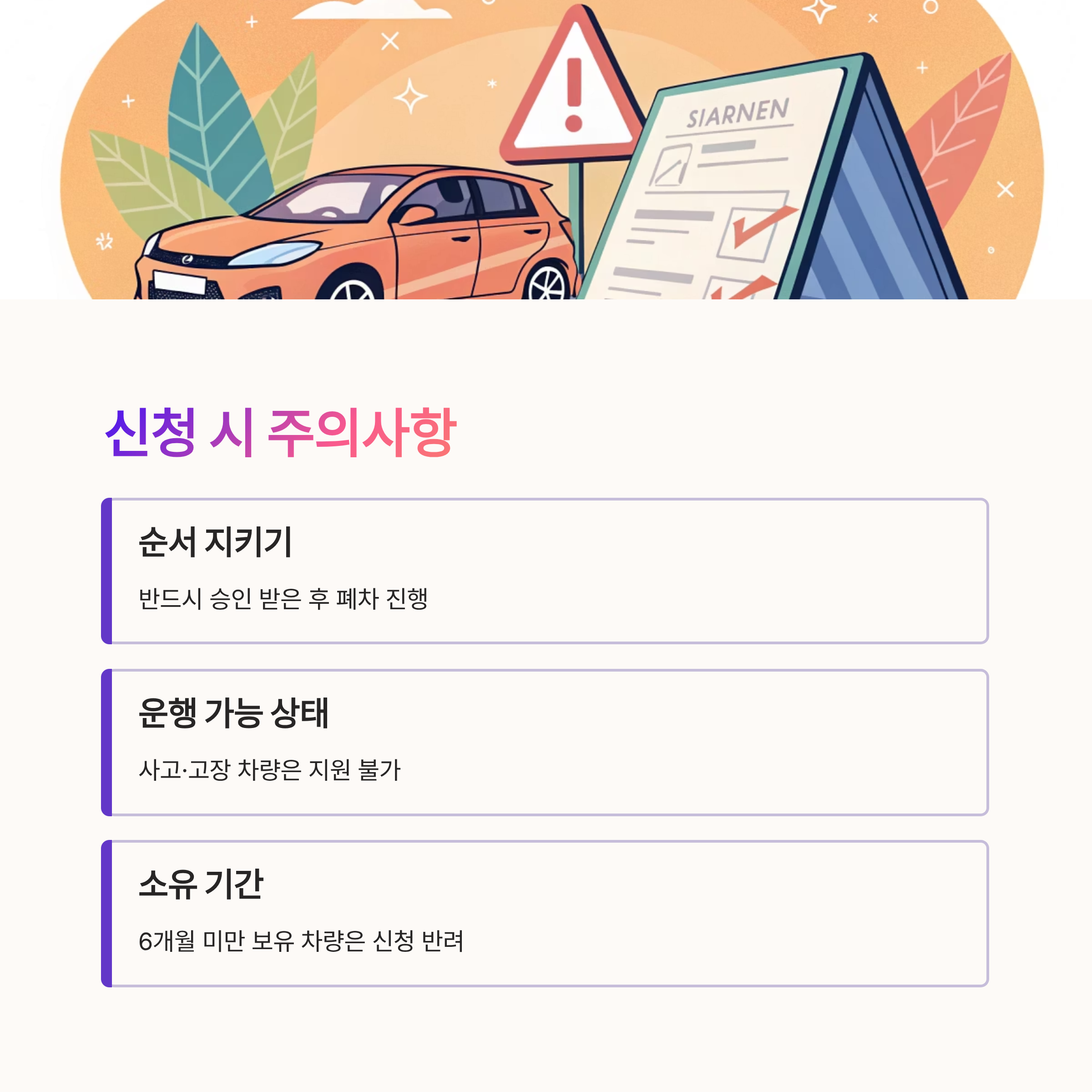 가장 먼저 주의할 점은 지자체 승인을 받기 전에 폐차를 진행하면 안 된다는 것이에요. 폐차 인증서가 신청 이전에 발급되면, 제도 대상에서 제외되기 때문에 꼭 순서를 지켜야 해요. 신청 → 승인 → 폐차 순서, 절대 바뀌면 안 돼요!