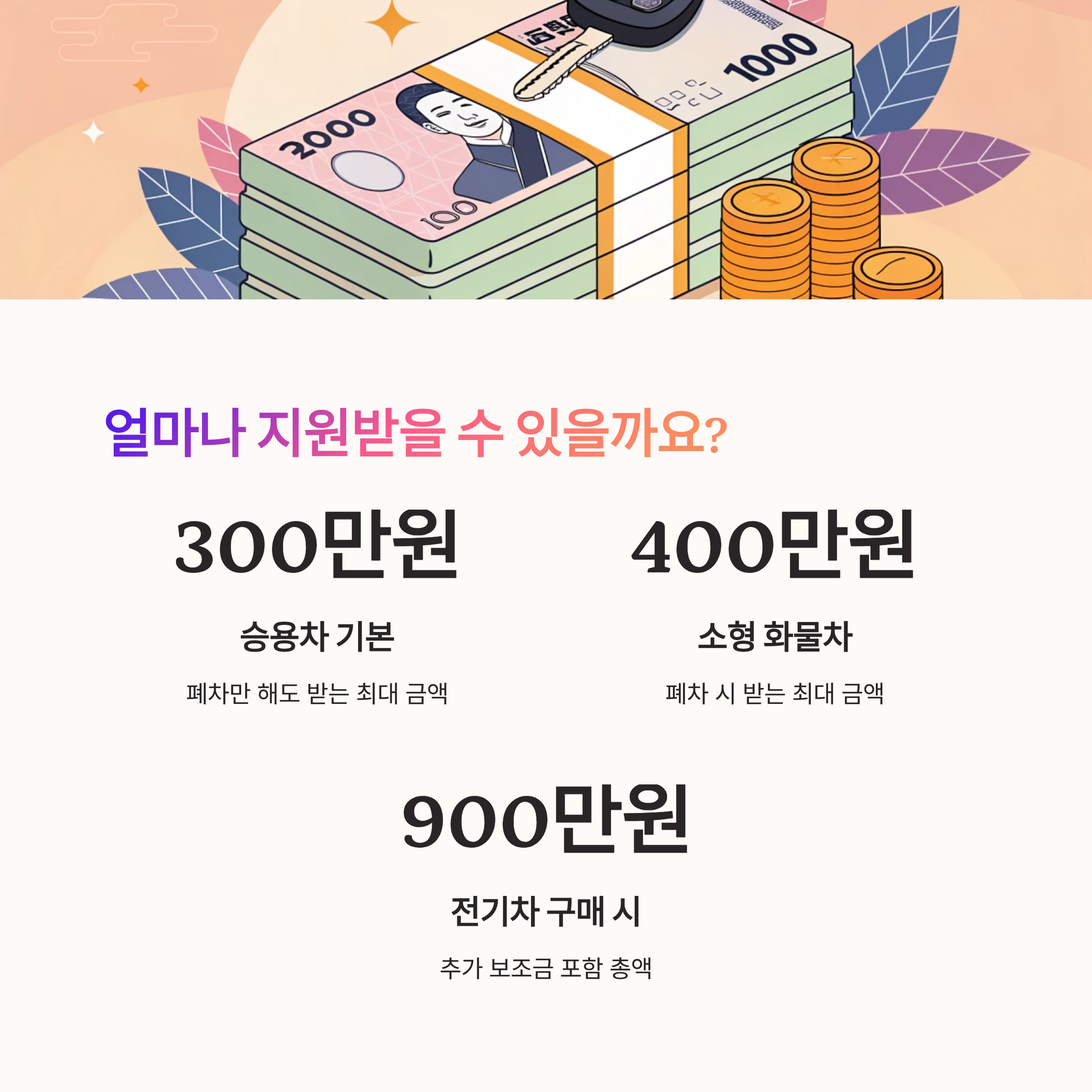 기본 보조금은 차량을 폐차하기만 해도 지급되는 금액이에요. 차량의 배기량, 연식, 총 중량 등에 따라 보조금 규모가 달라지는데요. 보통 승용차는 최대 300만원, 화물차는 최대 400만원까지 받을 수 있어요.