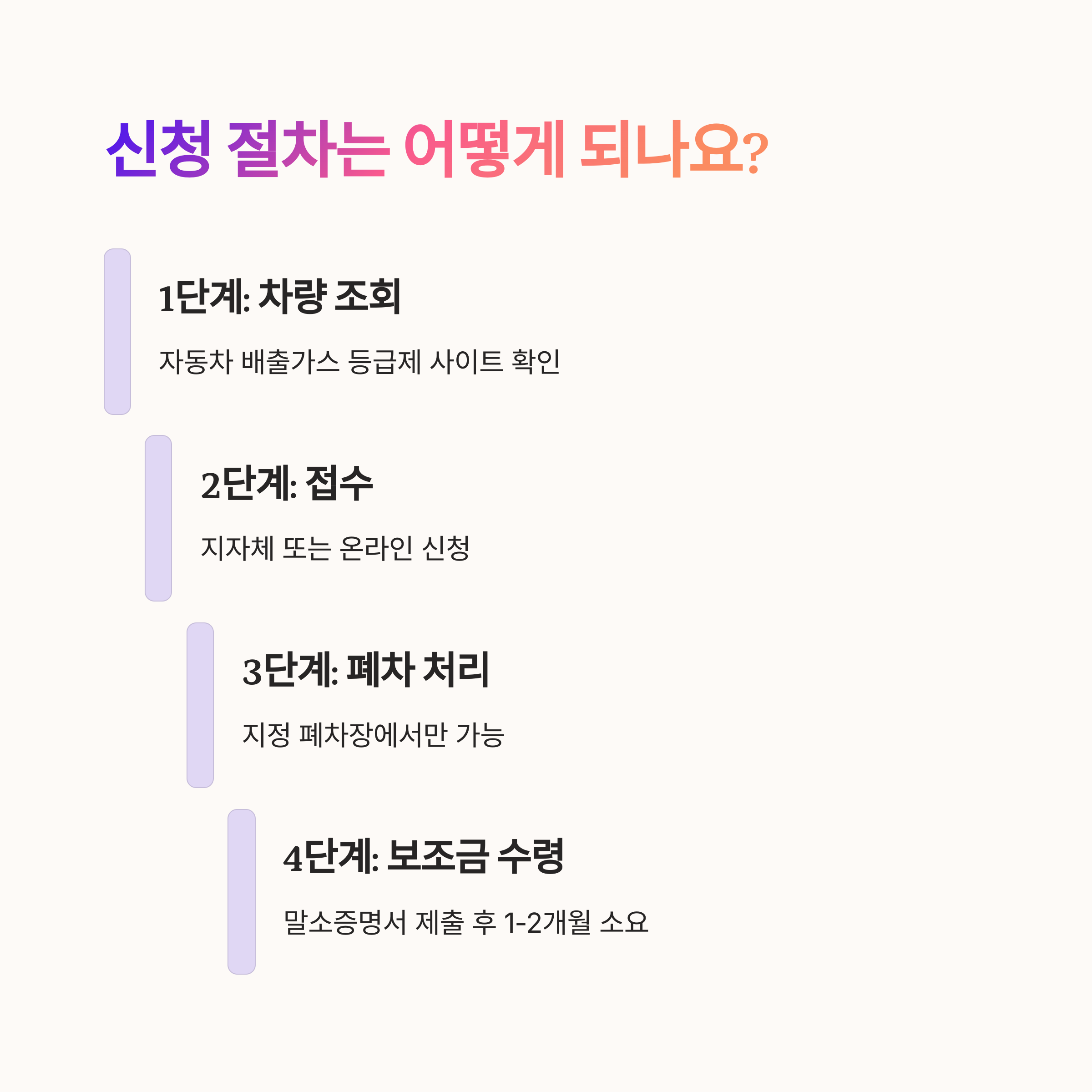 보통 신청은 아래 순서대로 진행돼요. 1) 대상 차량 조회 → 2) 조기폐차 지원 신청서 제출 → 3) 차량 폐차 및 말소 → 4) 말소증명서 제출 → 5) 보조금 지급. 이때 폐차장도 반드시 지정된 폐차장을 이용해야 해요.