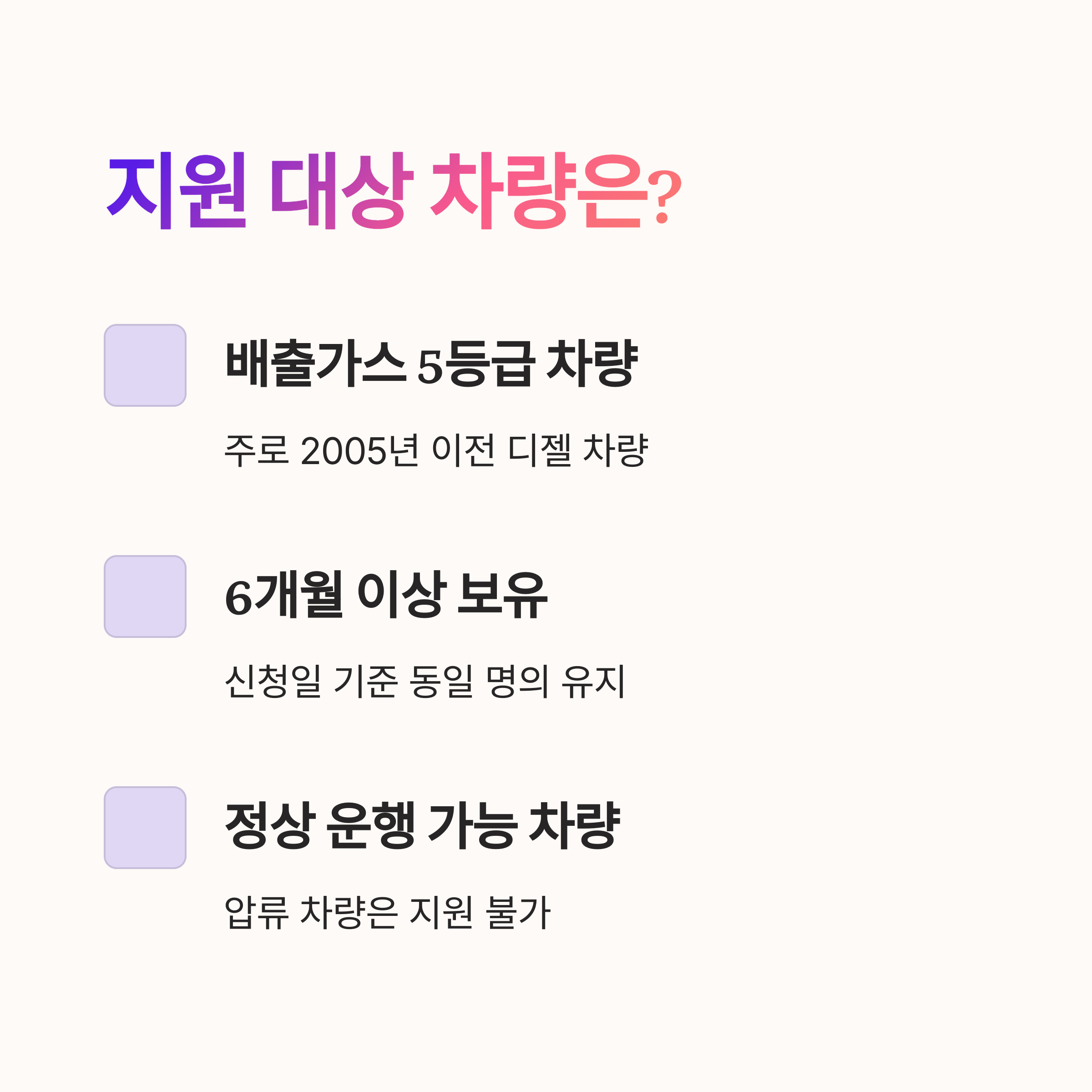 우선 지원 대상 차량은 ‘배출가스 5등급 차량’이 기본이에요. 이는 한국자동차환경협회 홈페이지에서 차량번호를 입력하면 확인할 수 있어요. 연식은 일반적으로 2005년 이전에 제작된 디젤 차량이 대부분이에요.