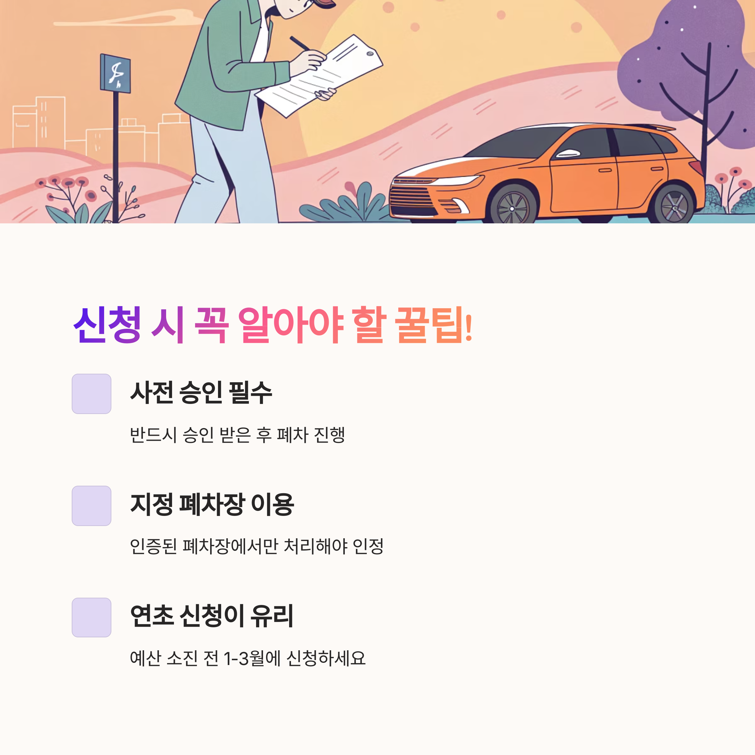 노후 차량 폐차 지원금을 받을 때, 그냥 신청한다고 무조건 지급되는 건 아니에요. 서류를 꼼꼼히 준비하고 순서를 정확히 지키는 것이 가장 중요해요. 지금부터 실수 없이 진행할 수 있는 꿀팁들을 정리해볼게요! 😊