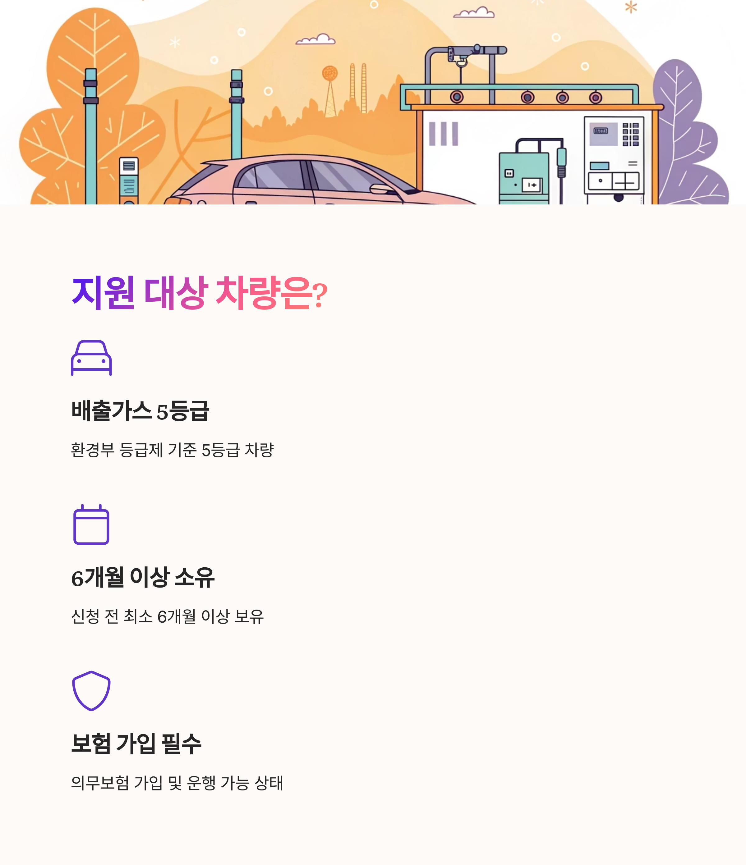 그다음은 소유 기간이에요. 차량을 신청 전까지 ‘6개월 이상’ 소유하고 있어야 해요. 중고차를 최근에 샀다면, 바로 지원받을 수 없다는 얘기죠. 이것은 투기 목적을 방지하기 위한 조건이에요.