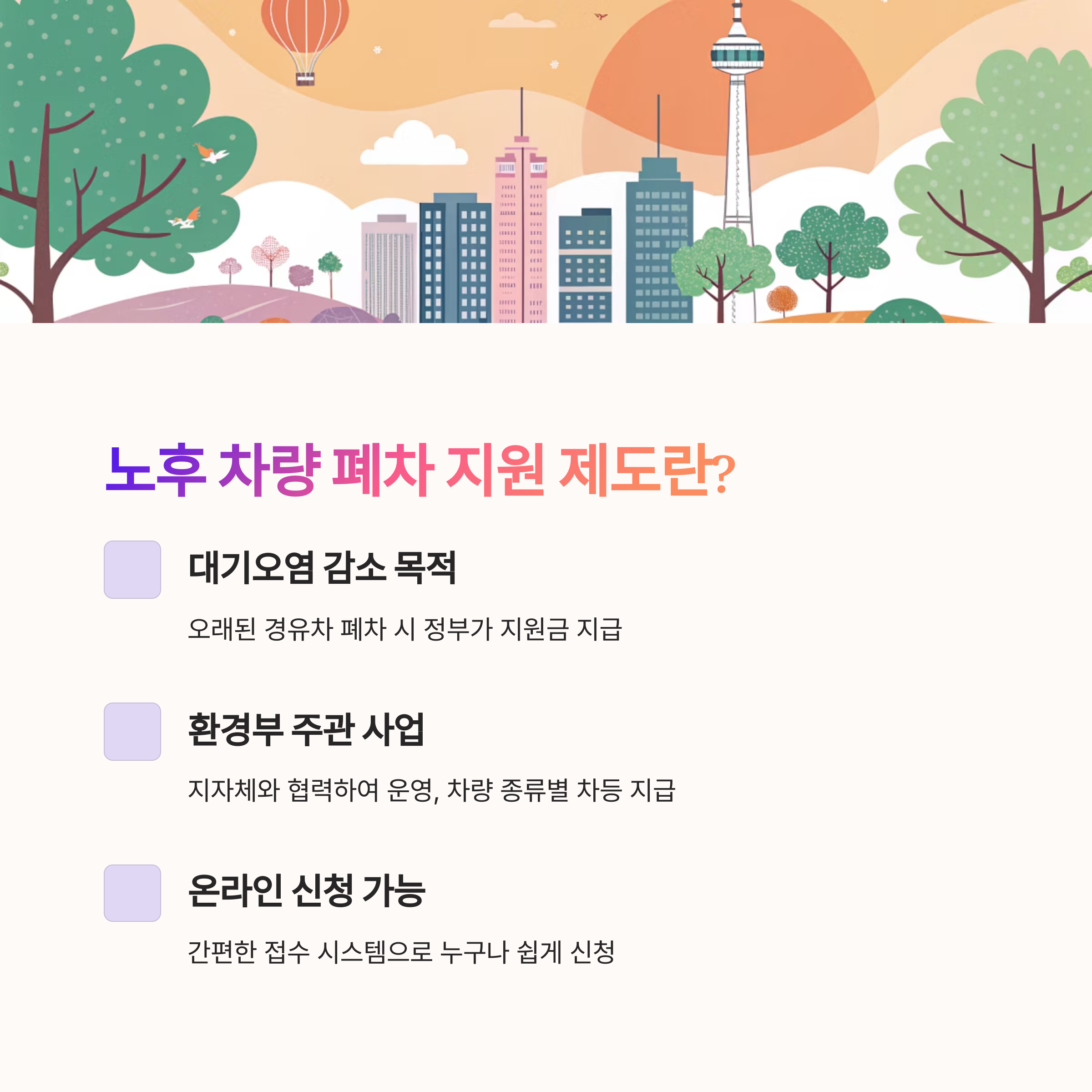 노후 차량 폐차 지원 제도는 대기오염을 줄이고 국민 건강을 지키기 위한 목적으로 시행 중인 정부 보조 사업이에요. 오래된 경유차나 배출가스가 많은 차량을 폐차하거나 수출용으로 판매하면, 국가나 지자체가 일정 금액을 보조해 주는 구조랍니다.