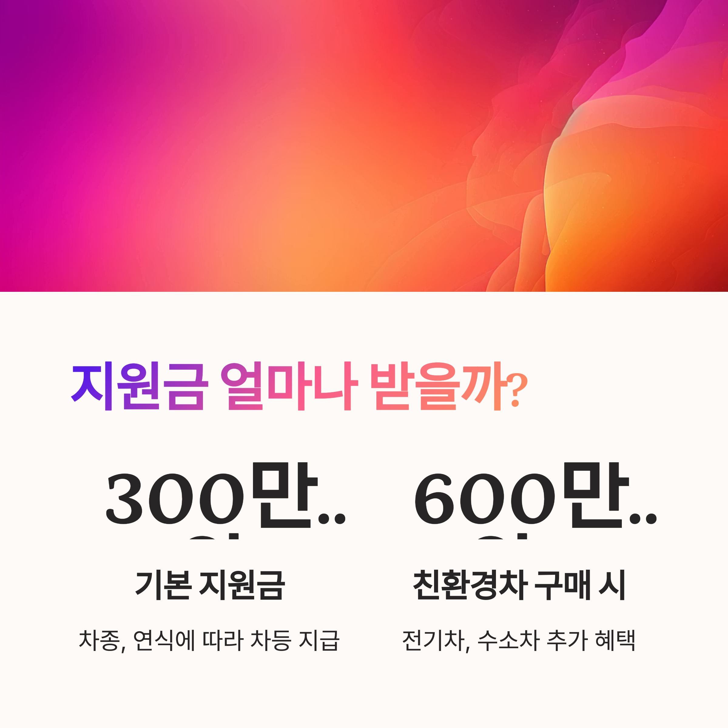💰 폐차 지원금의 금액은 차량의 종류, 연식, 배기량, 사용연료에 따라 달라져요. 보통은 차종별 기본 정액 보조금과 신차 구입 시 추가 지원금으로 구성돼요. 지원금은 최대 300만 원까지 받을 수 있고, 신차나 친환경차를 사는 경우에는 최대 600만 원 이상도 가능해요.