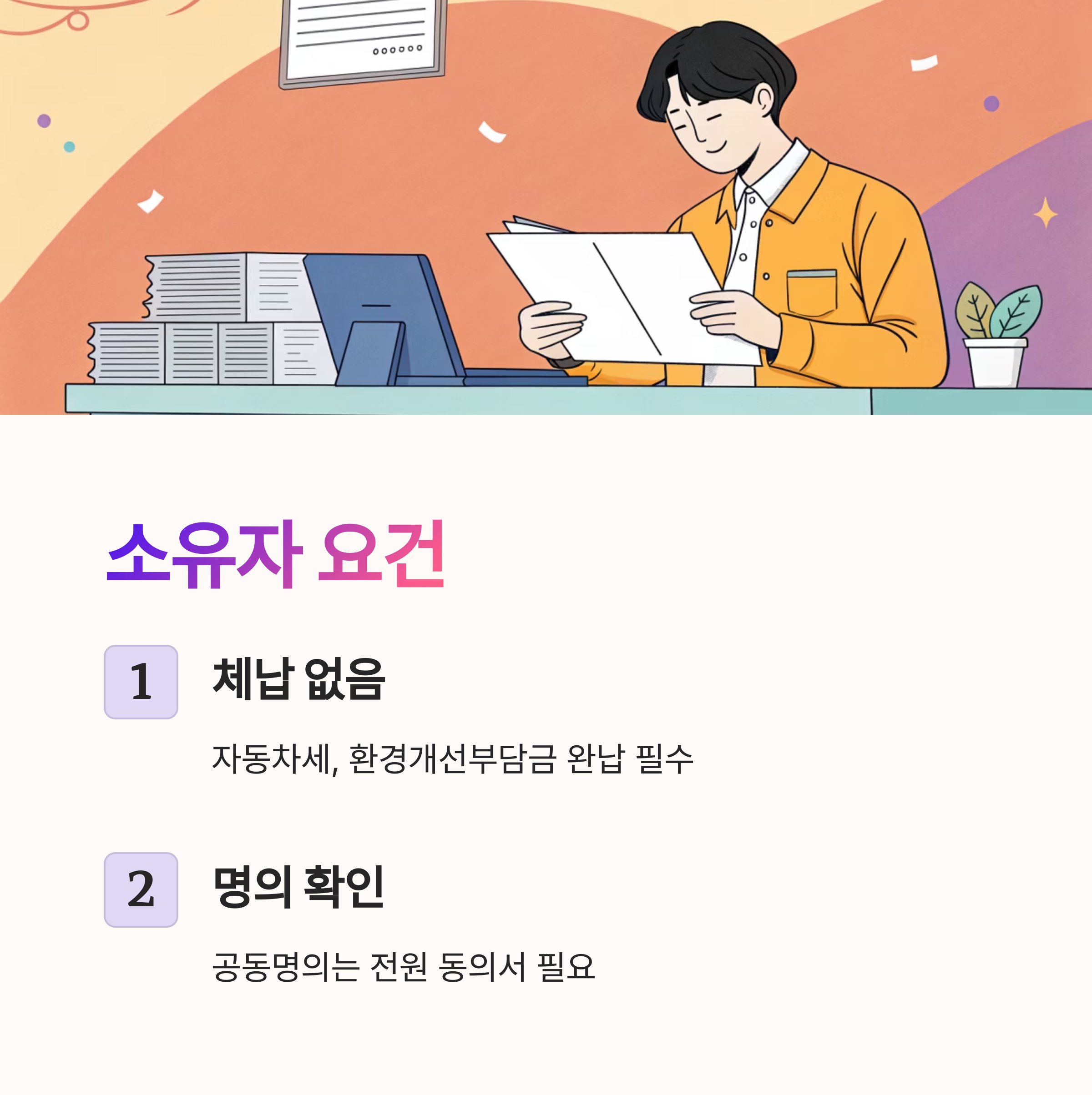소유자는 일반 개인은 물론 법인도 가능하지만, 법인의 경우 신청 조건이 조금 더 까다로울 수 있어요. 특히 렌터카 업체, 운수업체 등은 차량 운영 용도나 보험 이력까지도 심사 대상이 되기도 해요.