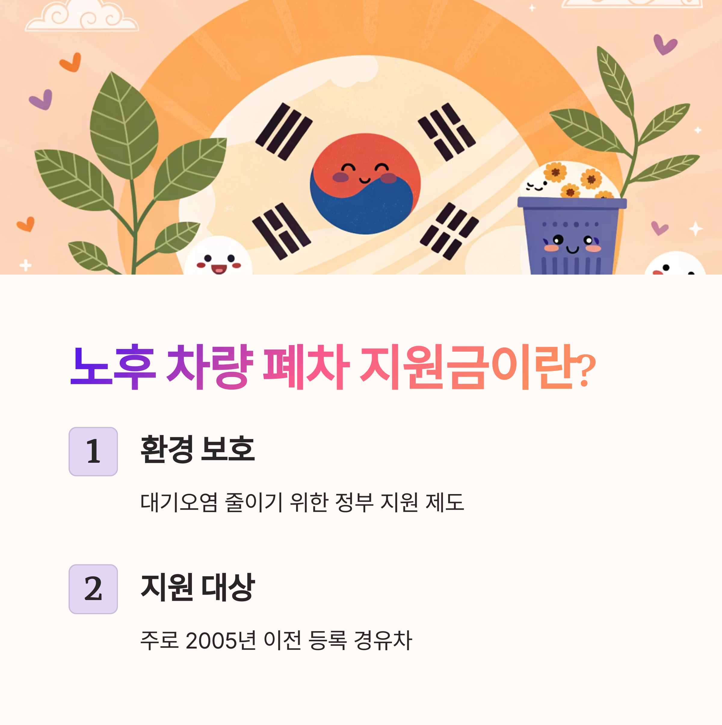 🚙 ‘노후 차량 폐차 지원금’은 일정 기준 이상으로 오래된 자동차를 자발적으로 폐차하면 정부가 일정 금액을 보조해주는 제도예요. 이 제도의 목적은 대기오염의 주요 원인 중 하나인 경유차를 중심으로 오염물질 배출을 줄이기 위한 것이죠.