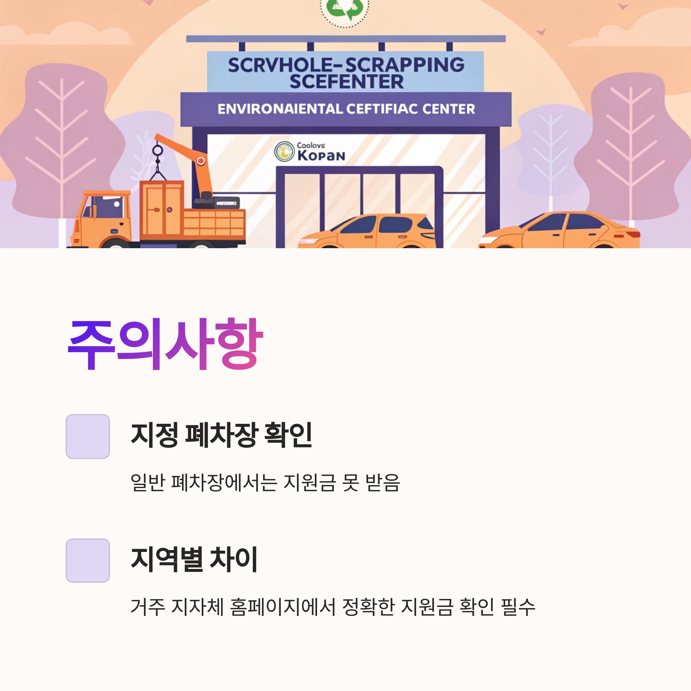 이처럼 지원금 차이가 크기 때문에, 동일한 차량이라도 어떤 방식으로 폐차하느냐에 따라 경제적인 이득이 달라져요. 무심코 일반 폐차를 선택했다간 나중에 후회할 수 있어요.