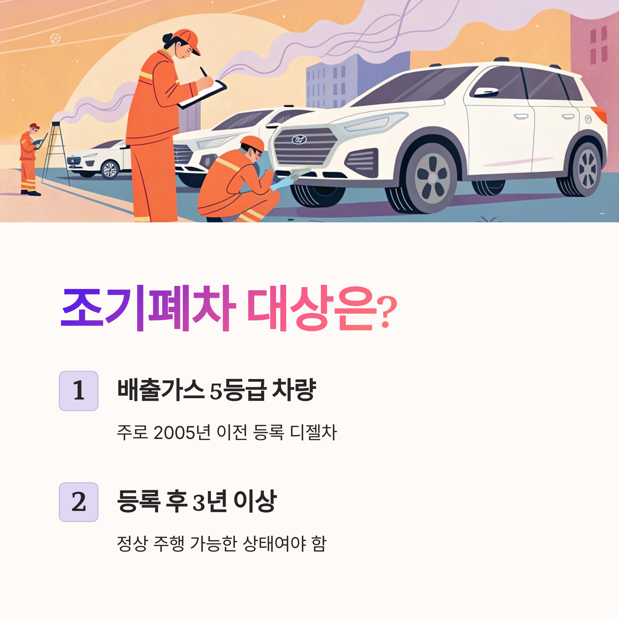 조기폐차는 단순히 폐차를 뜻하지 않아요. 일정 조건을 만족한 차량이 일정 시점보다 빠르게 폐차되면 ‘조기’로 인정받고, 그에 따른 보상을 받는 구조예요. 핵심은 이 조건에 맞춰야만 보조금을 받을 수 있다는 거예요.