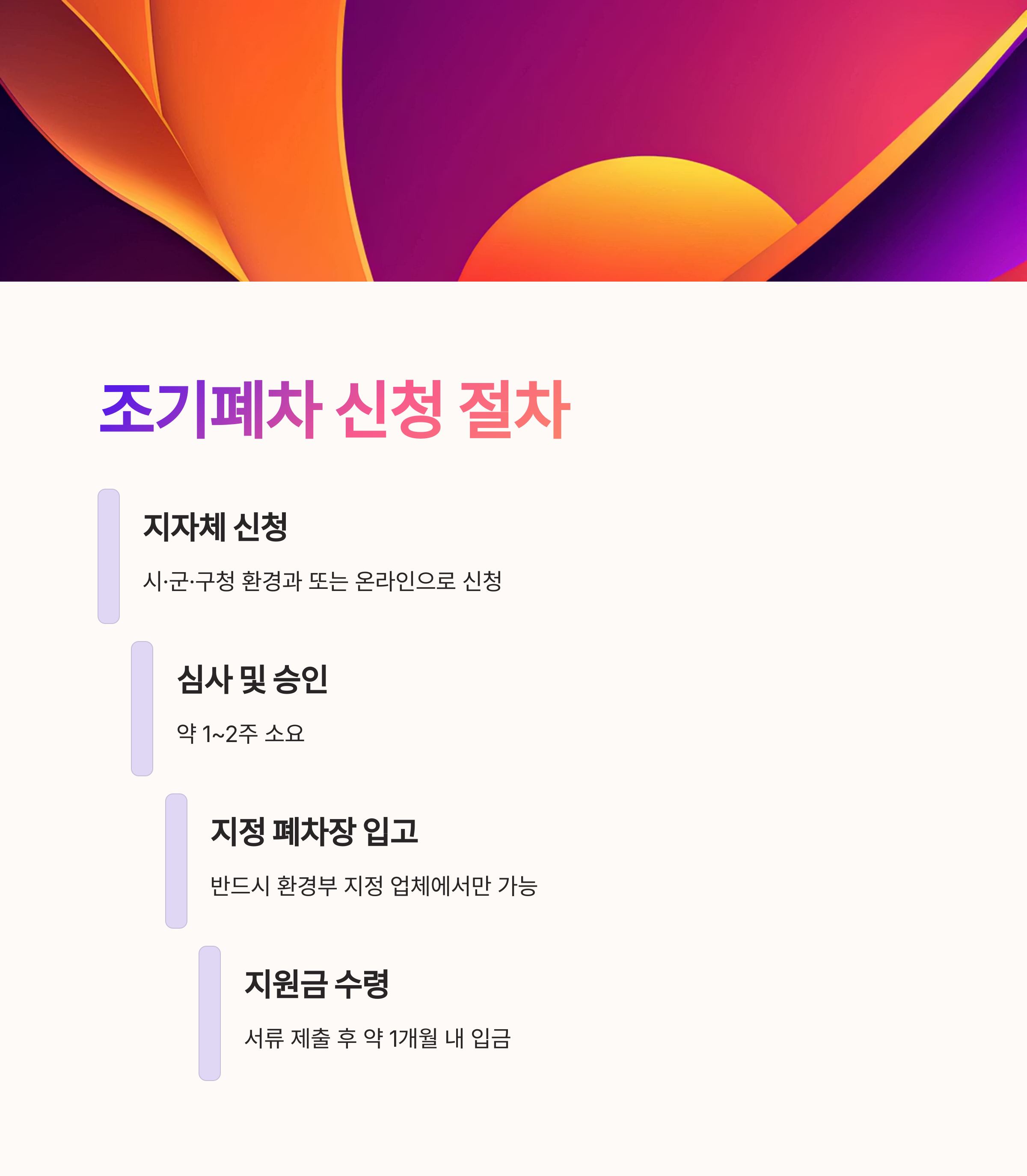 단순 폐차와 달리 조기폐차는 신청 후 승인을 받아야 하며, 일반 폐차소에서 처리하면 안 되고, 환경부 지정 폐차업체에서만 가능해요. 이러한 절차 때문에 시간을 두고 준비하는 게 좋아요.