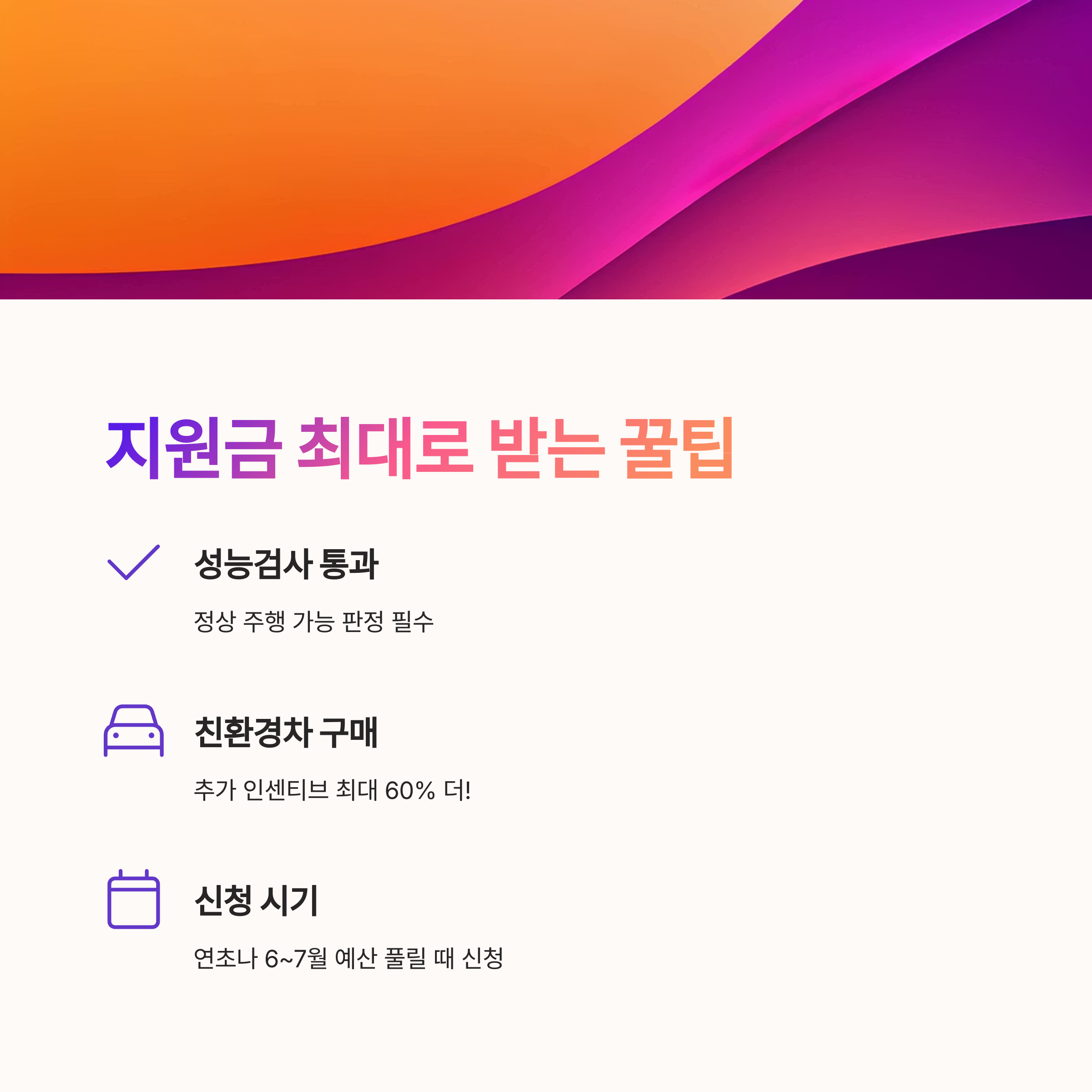조기폐차 지원금은 무조건 신청한다고 다 받을 수 있는 게 아니에요. 조건에 맞게 꼼꼼히 준비해야 실제로 최대 금액을 받을 수 있어요. 몇 가지 꿀팁을 정리해봤어요.