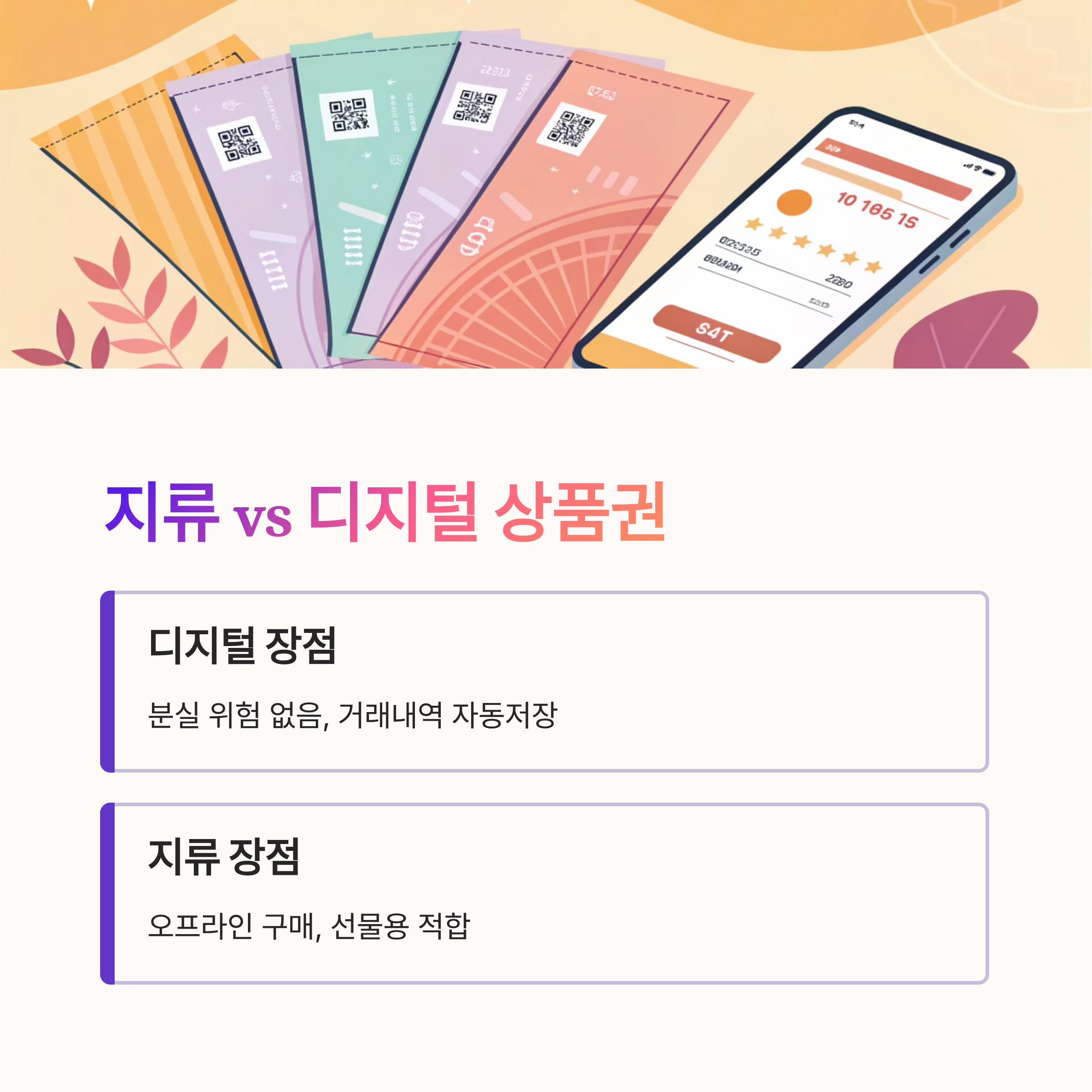 디지털 상품권은 거래 내역이 앱에 자동 저장되기 때문에 지출 관리가 쉽고, 분실이나 훼손 위험이 없어요. 반면 지류 상품권은 보관이 불편하고 분실 시 재발급이 어렵다는 단점이 있어요. 특히 지류는 유효기간이 상품권에 인쇄되어 있지만, 디지털은 앱에서 자동으로 관리되기 때문에 훨씬 관리가 수월하죠.