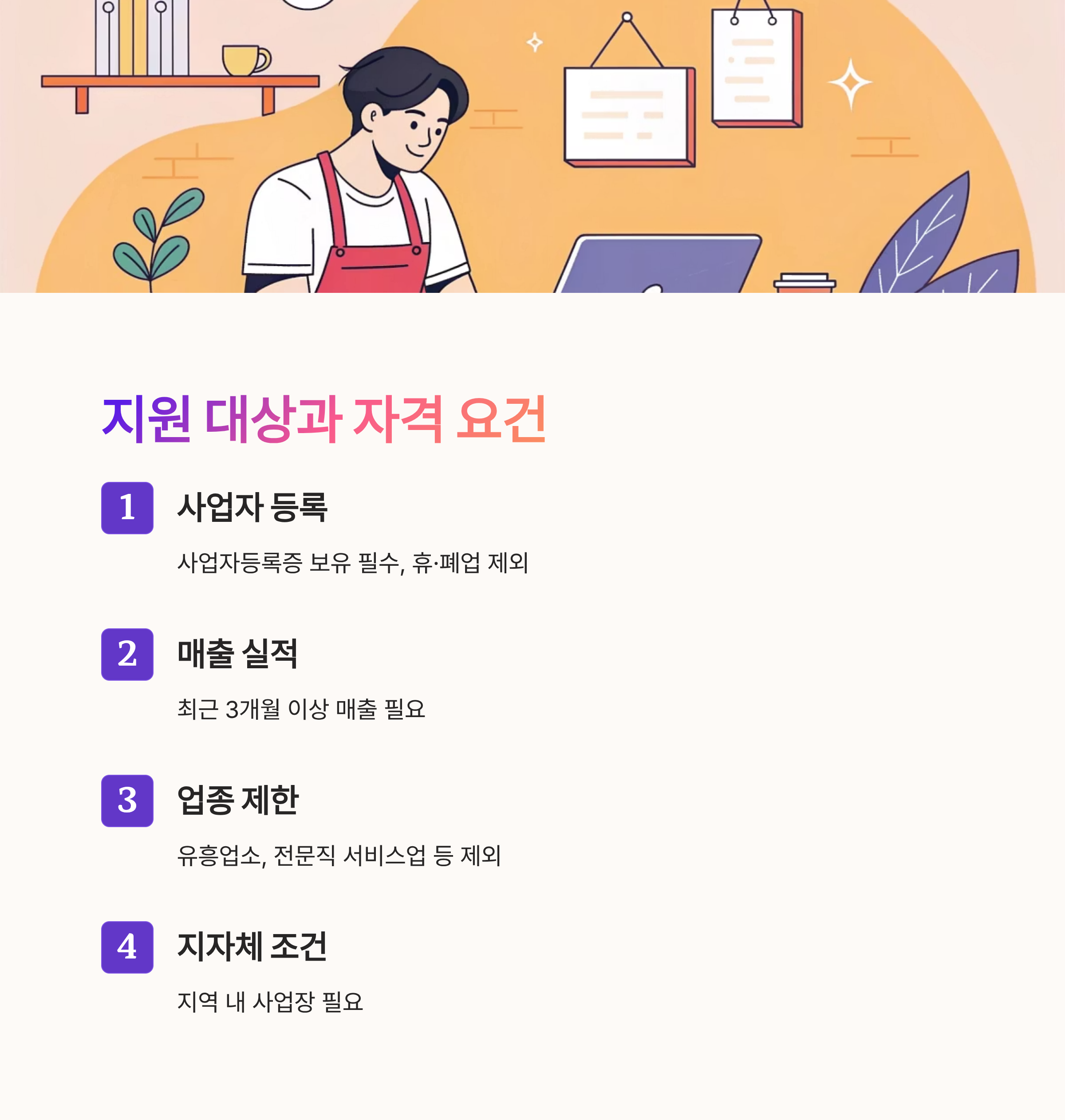 자격 요건을 보면, 우선 사업자등록증 보유는 필수예요. 또한 휴·폐업 상태가 아니어야 하고, 부가가치세 미과세 사업자라 하더라도 일정 기준 충족 시 신청이 가능해요. 사업장을 여러 개 운영하는 경우 대표자 기준으로 1회만 신청할 수 있으며, 중복 신청은 제한돼요. 다만, 정부 지원형과 지자체 지원형을 병행할 수 있는 경우가 있어 정책별 안내를 꼼꼼히 살펴보는 게 중요해요.