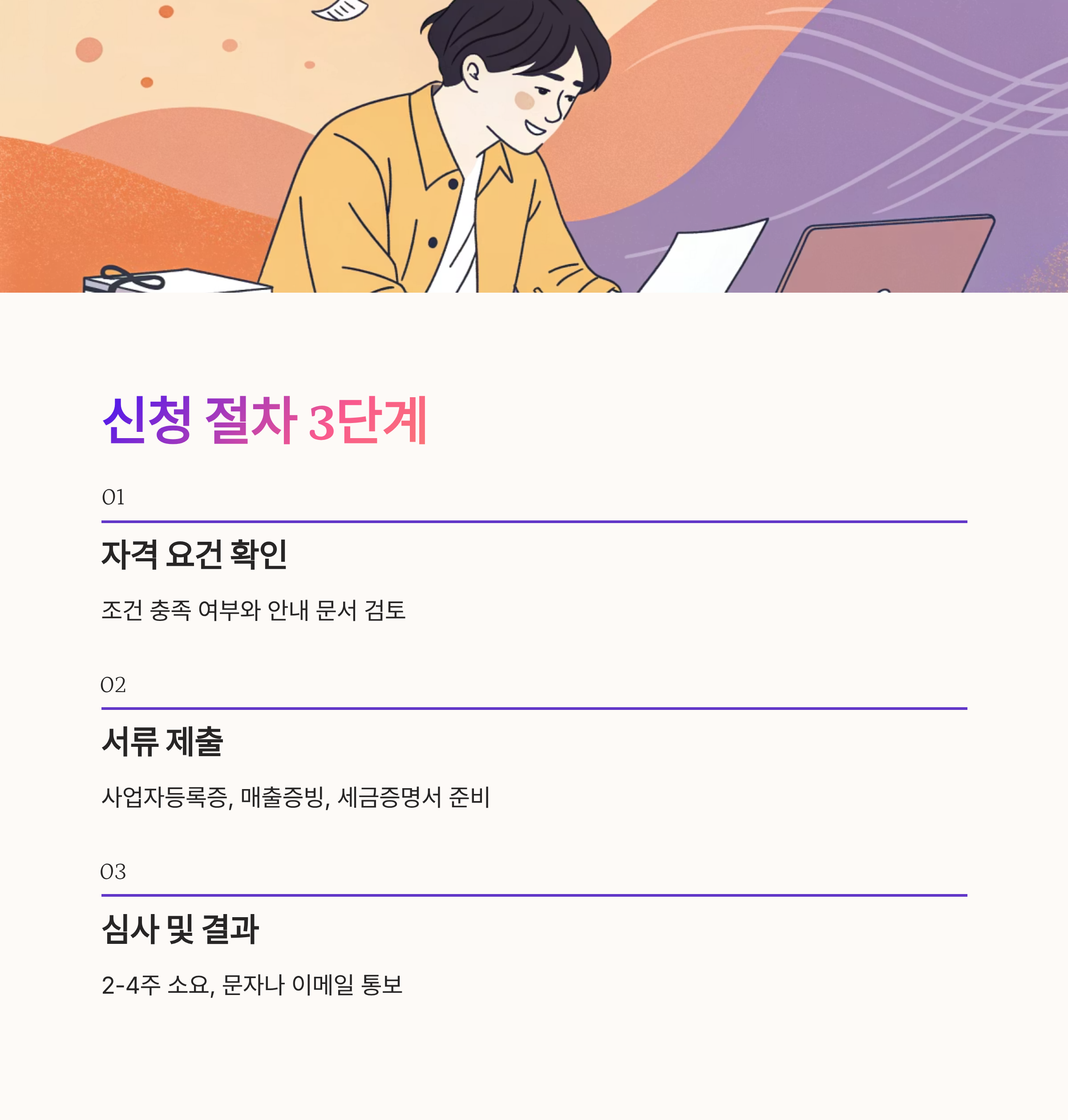 신청 과정은 보통 3단계로 진행돼요. 첫째, 자격 요건 확인 단계예요. 본인이 해당 조건을 충족하는지 확인한 뒤 안내 문서를 꼼꼼히 읽어야 해요. 둘째, 서류 제출 단계예요. 이때 사업자등록증, 매출 증빙 자료, 임대차 계약서, 세금 납부 증명서 등을 준비해야 해요. 셋째, 심사 및 결과 통보 단계예요. 심사는 보통 2~4주 정도 소요되며, 결과는 문자나 이메일로 안내돼요.