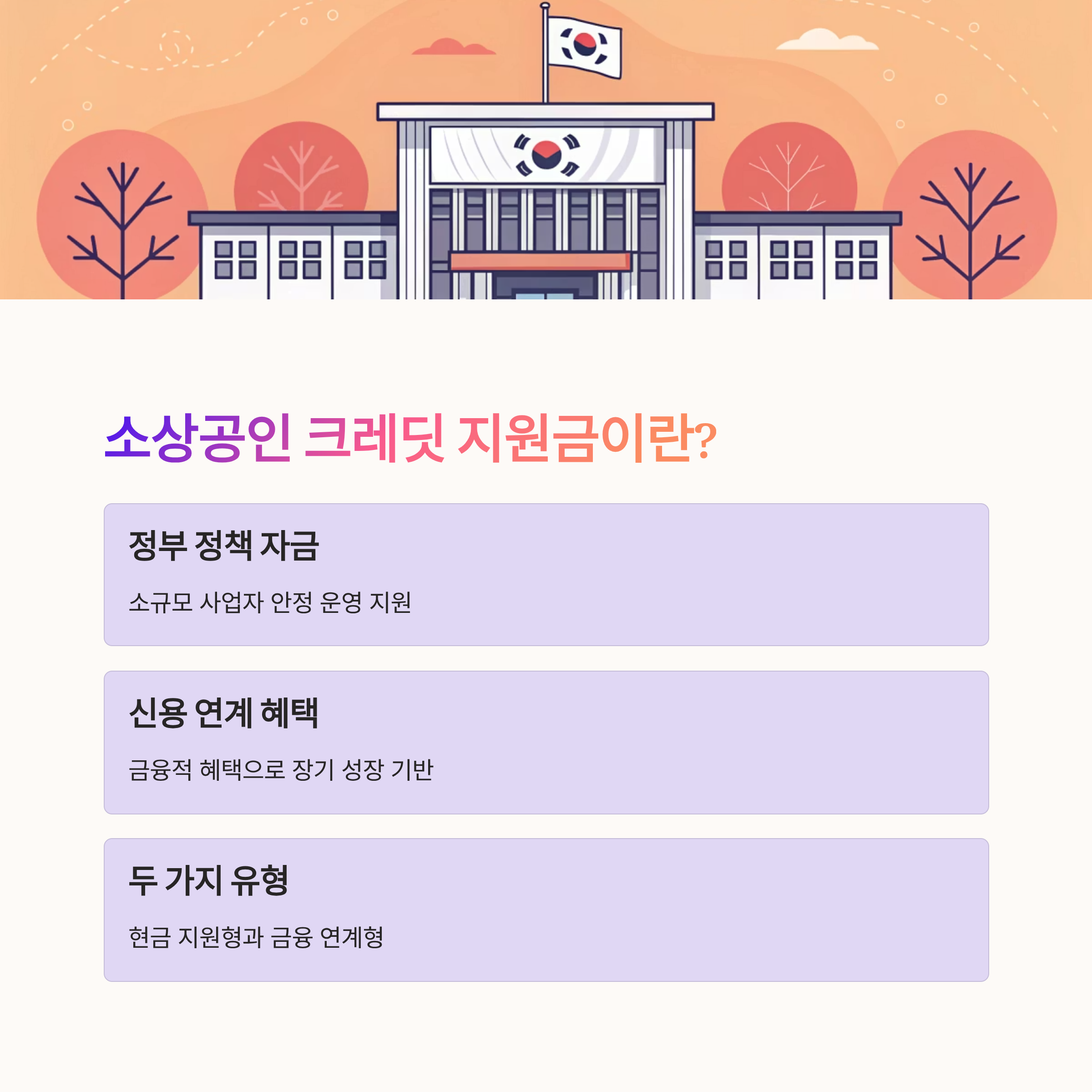 소상공인 크레딧 지원금은 정부와 지방자치단체가 함께 추진하는 정책 자금 중 하나예요. 자금력이 부족한 소규모 사업자가 안정적으로 운영을 이어가도록 돕는 데 목적을 두고 있죠. 이 제도는 단순한 현금성 보조금이라기보다 신용도와 연계된 금융적 혜택이 많아서, 장기적인 성장과 재도약에 기반을 마련해 줘요.