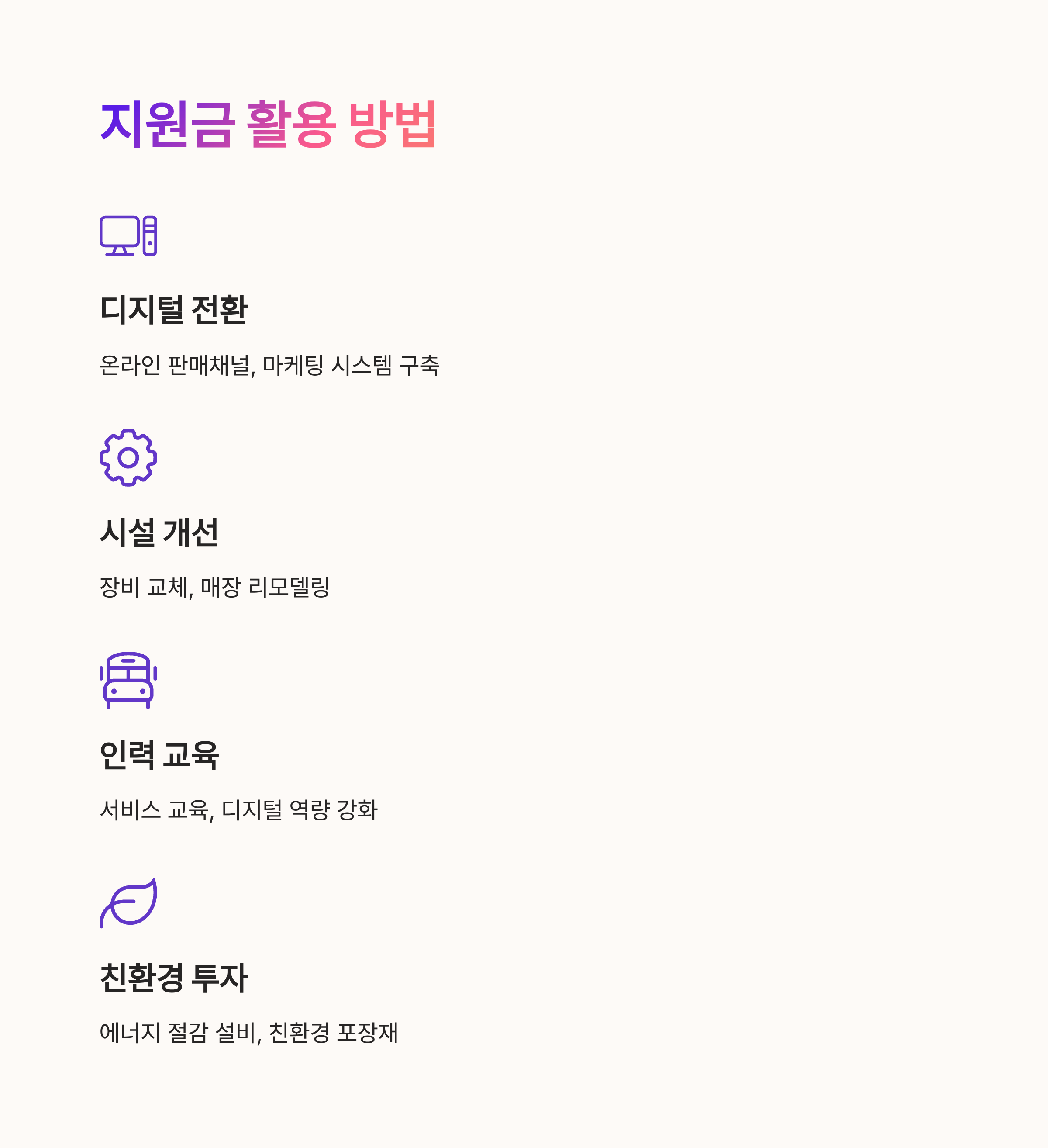 | 친환경·디지털 전환 | 에너지 절감 장비, 온라인 주문 시스템 | 정책 우대, 미래 경쟁력 강화 |