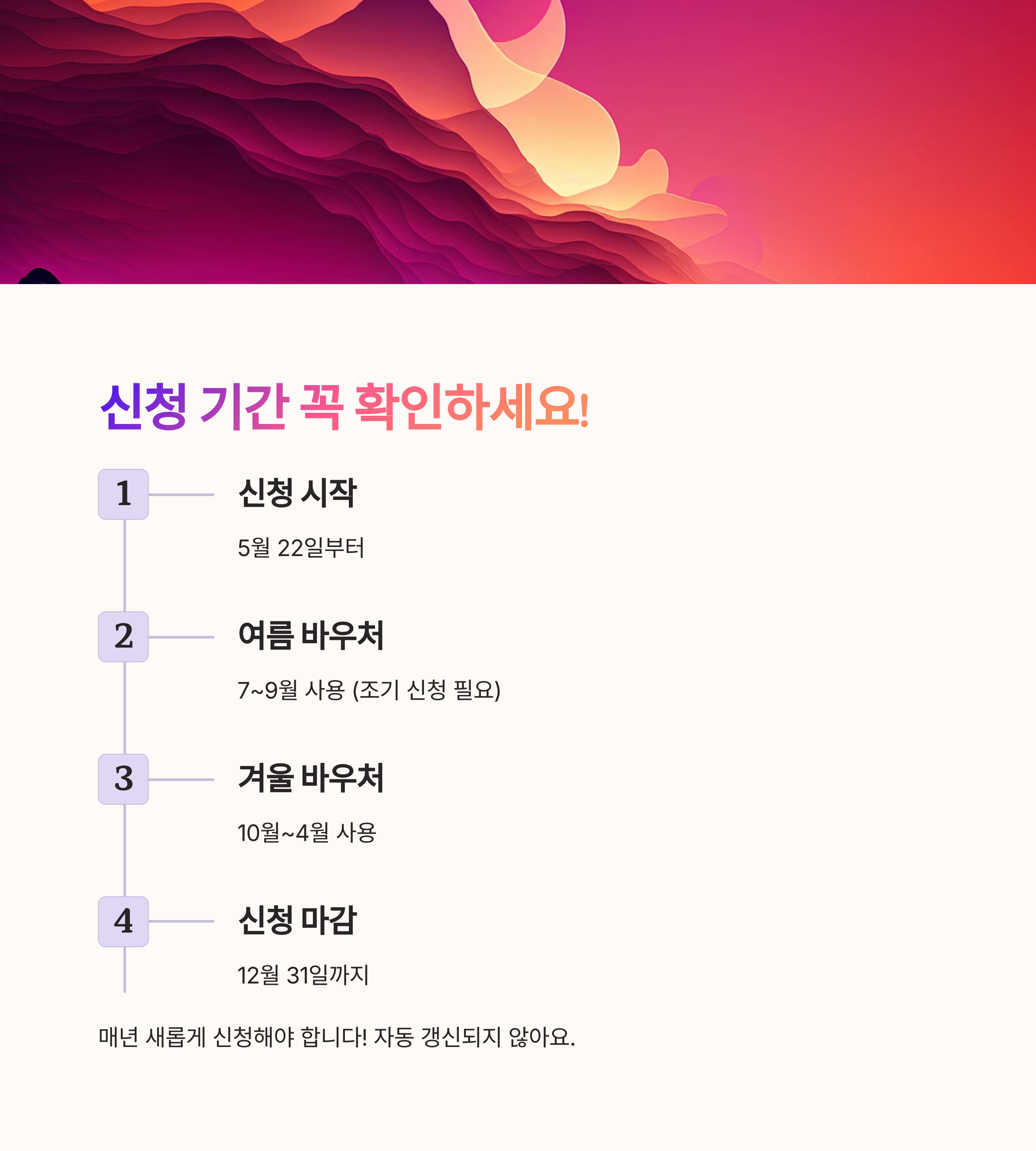 에너지 바우처 신청 기간은 매년 비슷하게 진행되며, 2025년의 경우 5월 22일부터 12월 31일까지예요. 하지만 너무 늦게 신청하면 여름 바우처는 받을 수 없고, 겨울 바우처만 가능하니 가능한 한 빨리 신청하는 걸 추천해요!