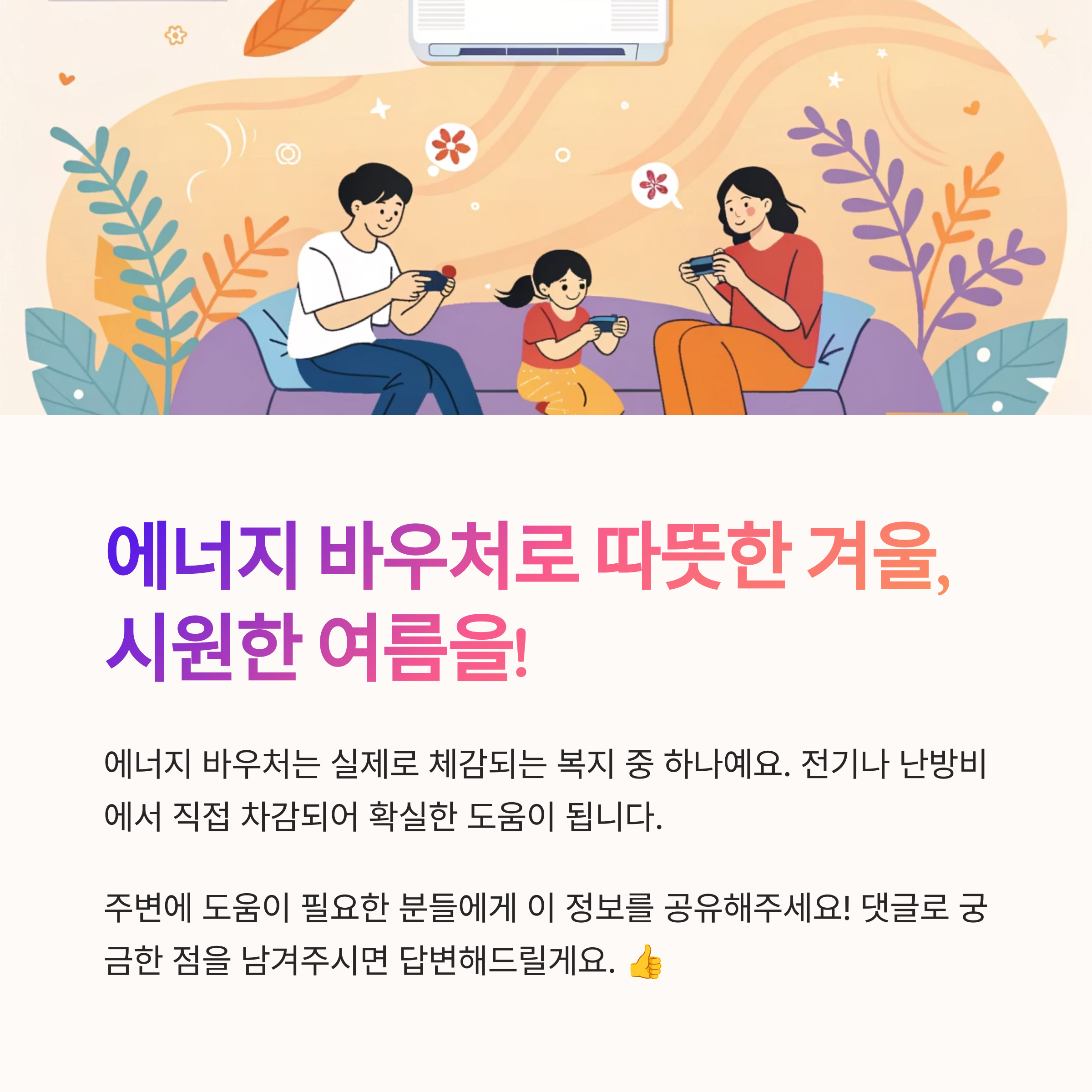 내가 생각했을 때 에너지 바우처는 실제로 체감되는 복지 중 하나예요. 다른 지원금은 절차도 어렵고 실효성이 떨어질 수 있는데, 이건 직접 전기나 난방비에서 빠지니까 확실히 도움이 돼요. 👏