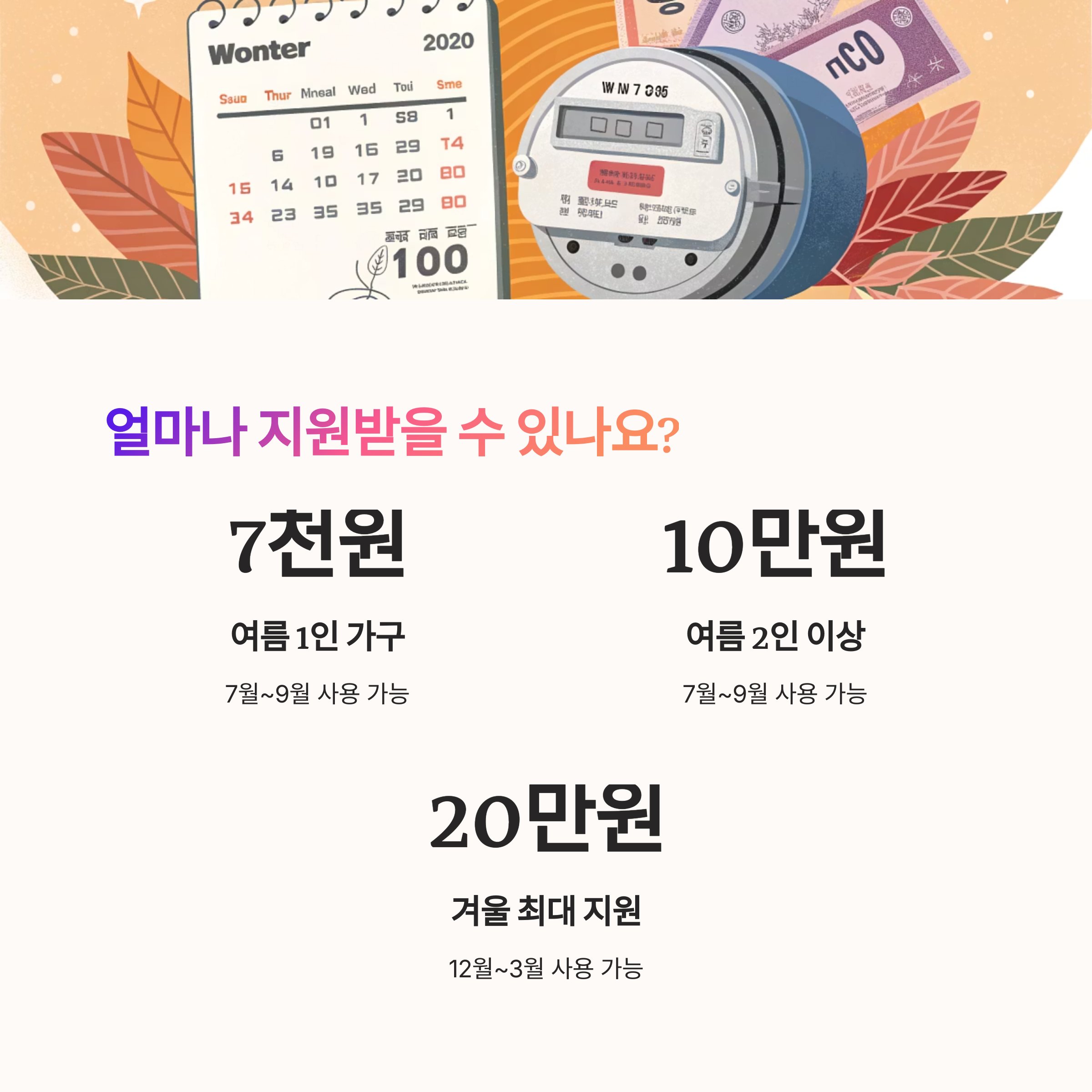 | 지원 금액 | 여름 7천~1만 원 / 겨울 최대 20만 원 |