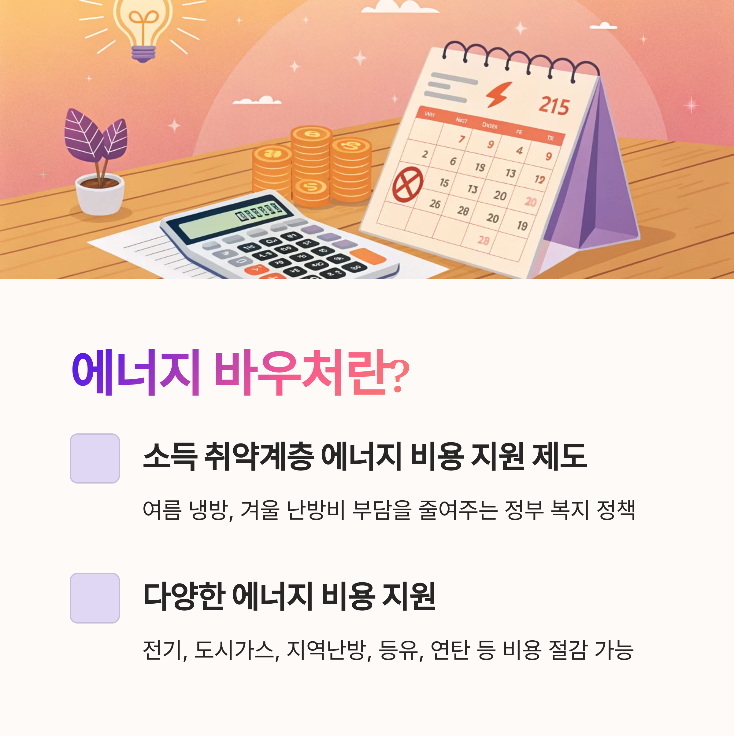 에너지 바우처는 소득이 낮은 가구가 여름철 냉방과 겨울철 난방을 걱정 없이 사용할 수 있도록 정부가 에너지 비용을 지원하는 제도예요. 특히 기초생활수급자나 차상위계층처럼 생활비에 대한 부담이 큰 가구를 중심으로 시행되고 있어요. 이 바우처를 통해 전기, 도시가스, 지역난방, 등유, 연탄 등의 비용을 절약할 수 있답니다.