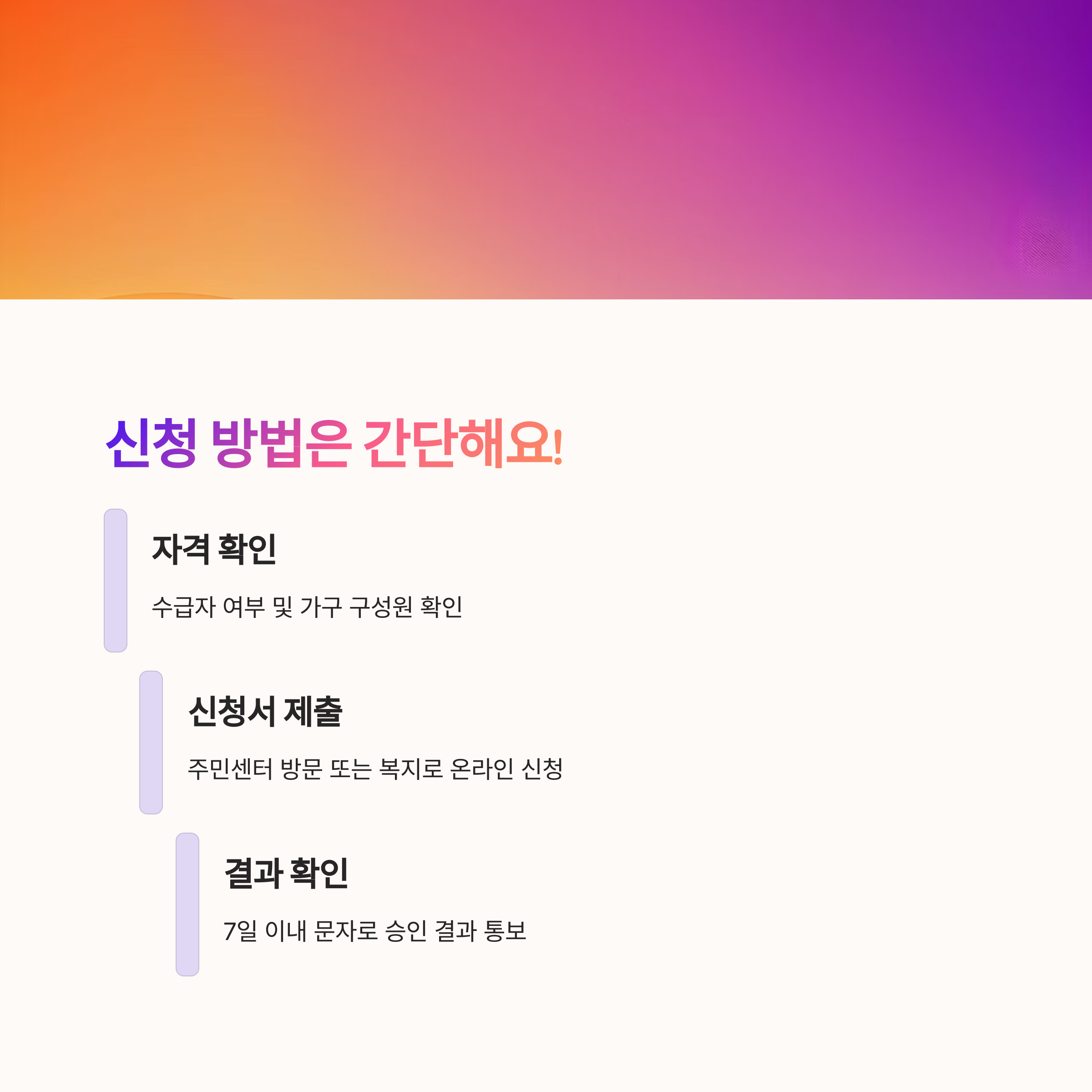 | 1단계 | 신청 대상 여부 확인 (수급자 및 가구 구성 확인) |
