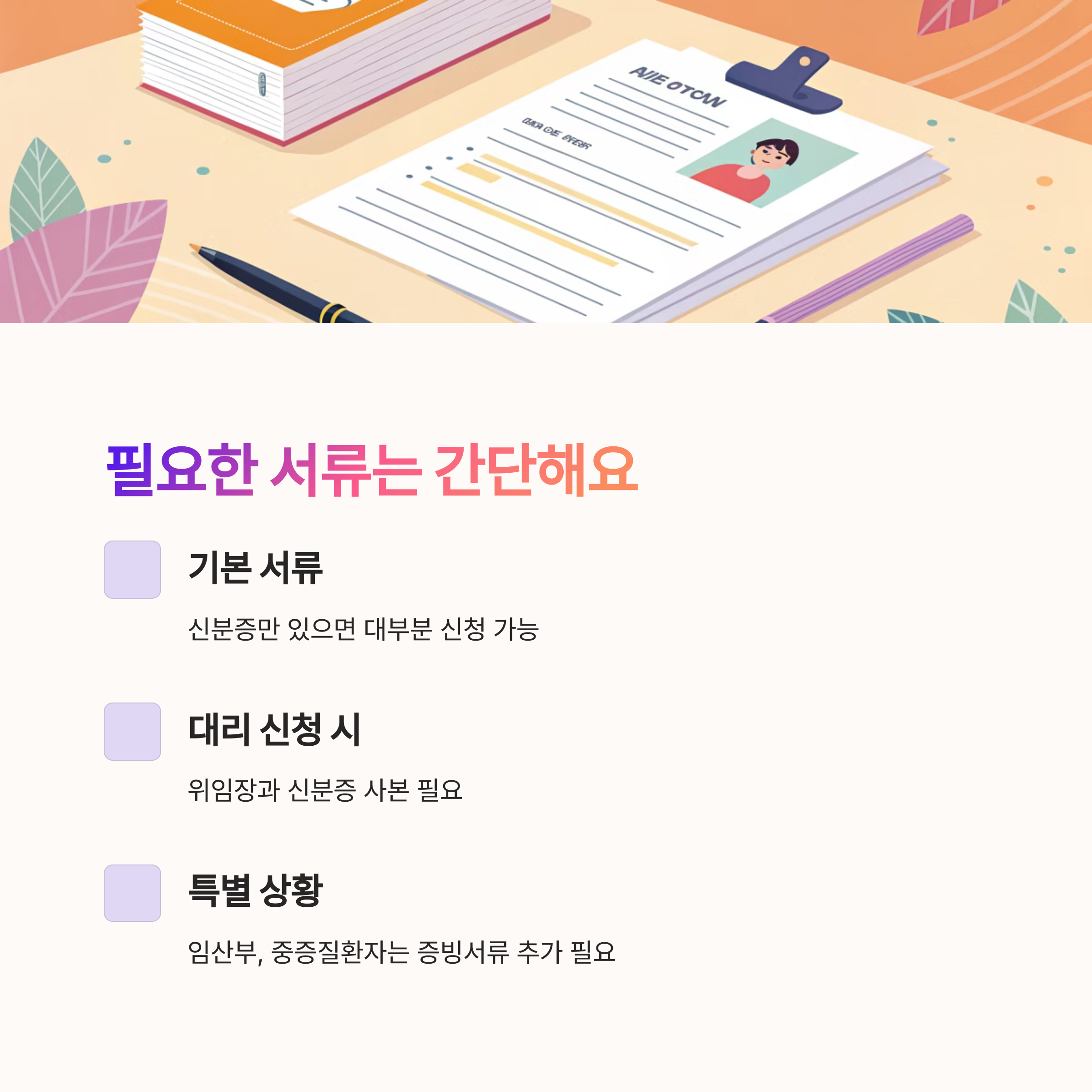 대리인이 신청할 경우에는 위임장과 위임을 받는 사람(신청인)과 위임하는 사람(수혜자)의 신분증 사본이 필요해요. 특히 노약자나 거동이 불편한 사람의 경우 가족이 대신 가는 일이 많아서 이 서류는 미리 챙겨두는 게 좋아요.