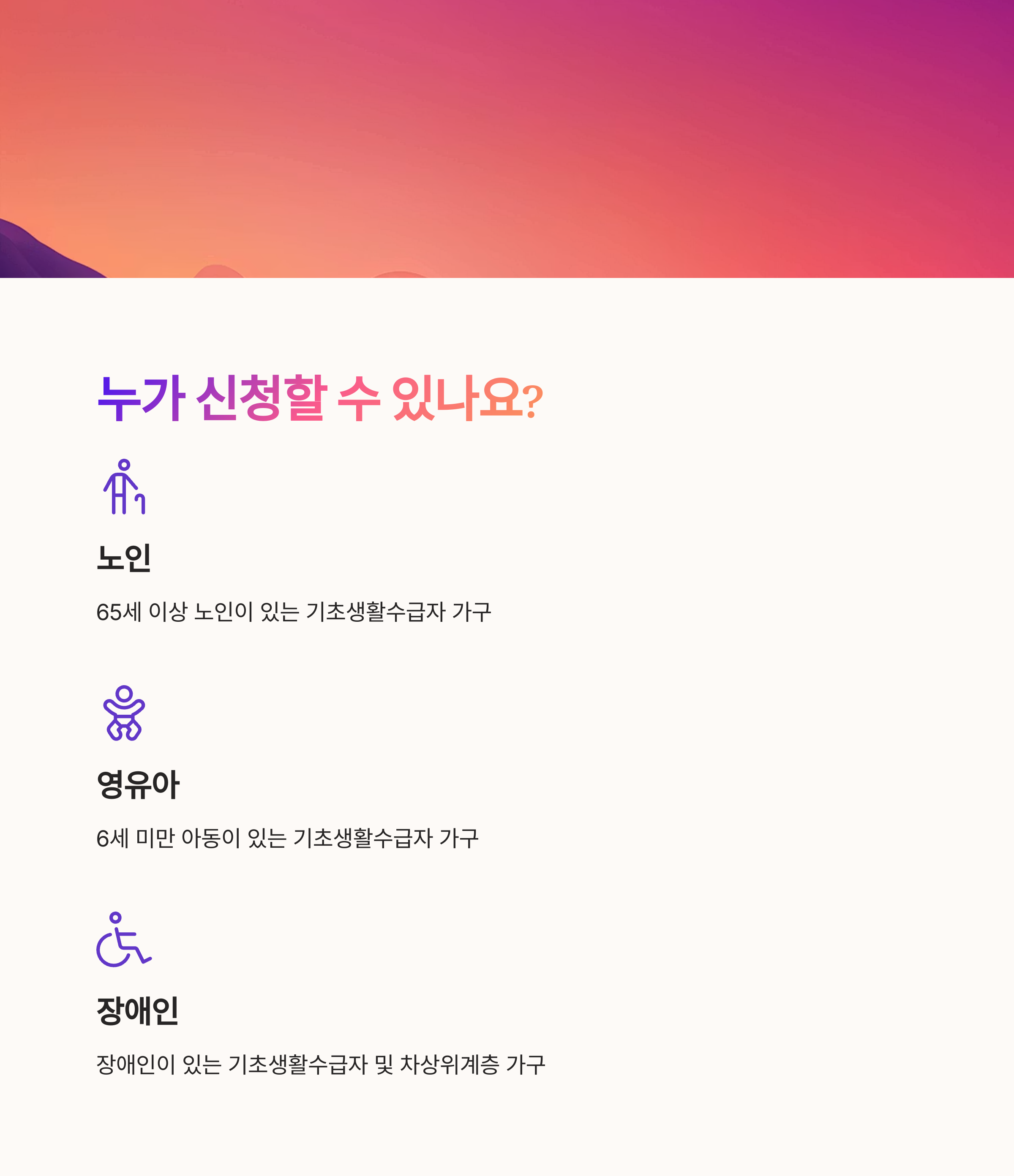 여기서 중요한 포인트는 ‘세대 단위’로 지원한다는 점이에요. 예를 들어, 세대주가 생계급여 수급자이고, 세대원 중에 6세 미만 영유아가 있다면 신청할 수 있어요. 하지만 혼자 사는 성인 청년이 생계급여를 받더라도, 다른 취약 조건이 없으면 신청이 어려울 수도 있어요.