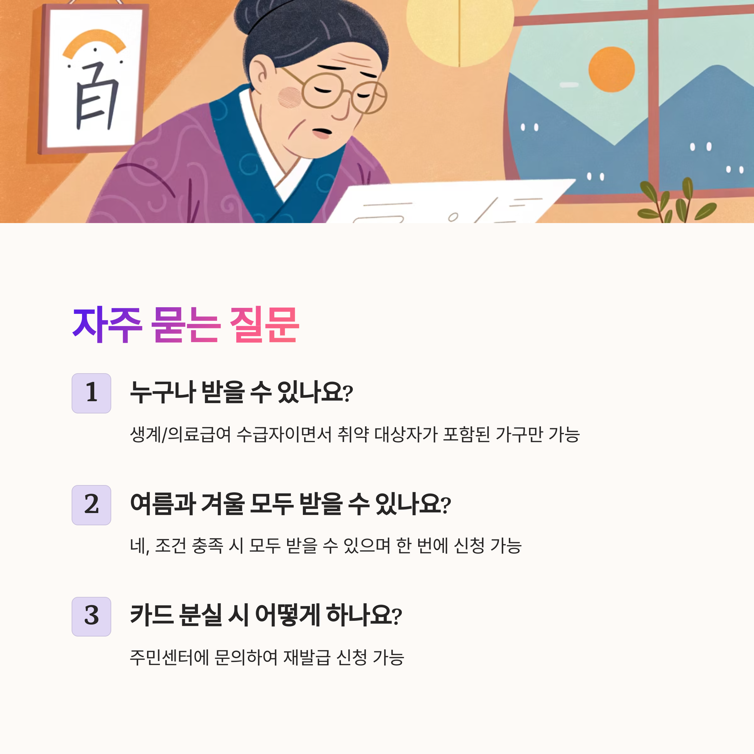 사용처는 각 지자체 및 에너지공단 홈페이지에서 확인할 수 있어요. 이 바우처 카드는 일종의 '에너지 통장' 같은 개념으로 이해하면 되며, 제대로만 활용하면 요금 걱정을 확 줄일 수 있는 꿀템이에요! 😎
