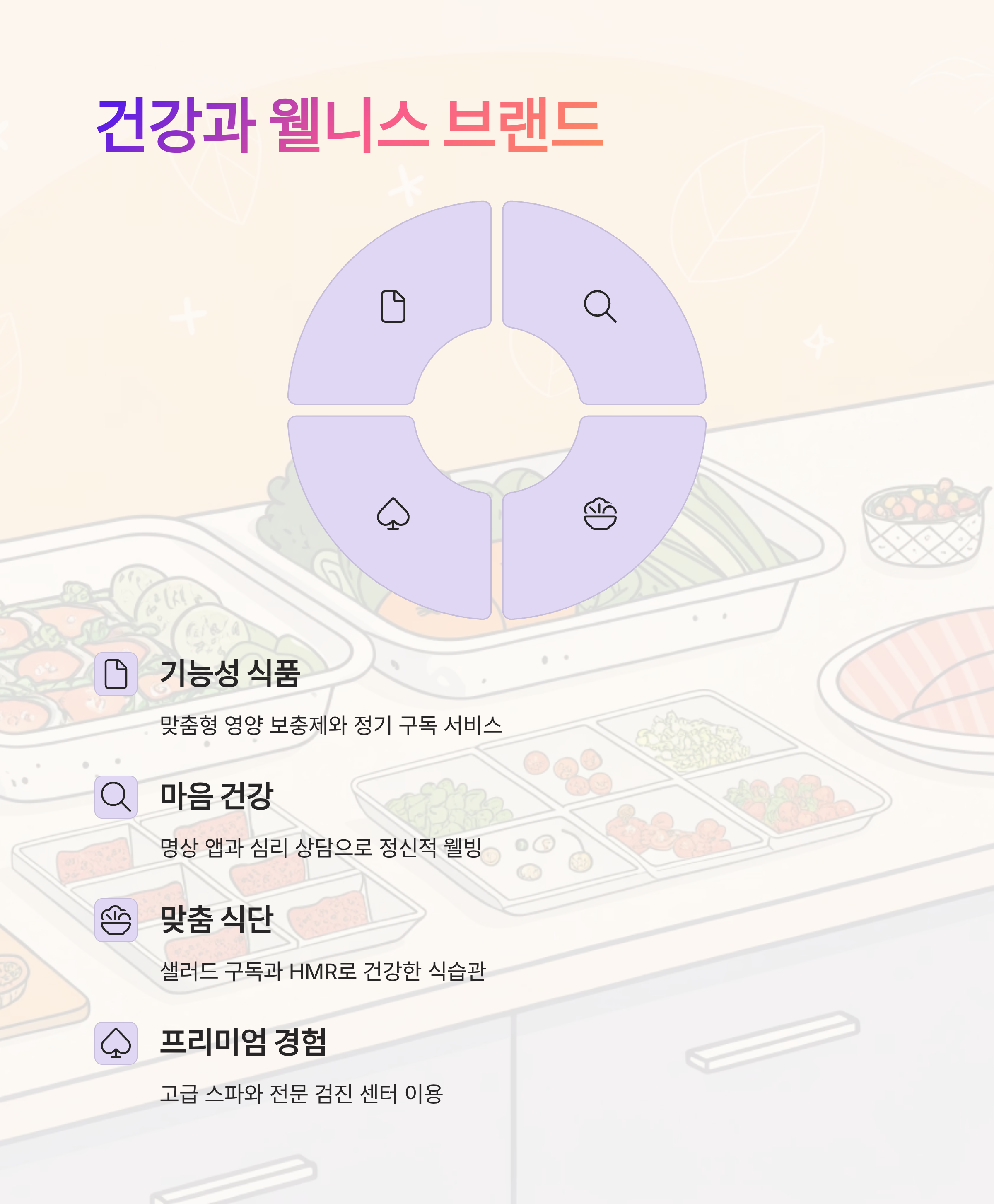 | 식습관 | 맞춤형 식단 관리 | 샐러드, HMR | 구독+간편식 |
