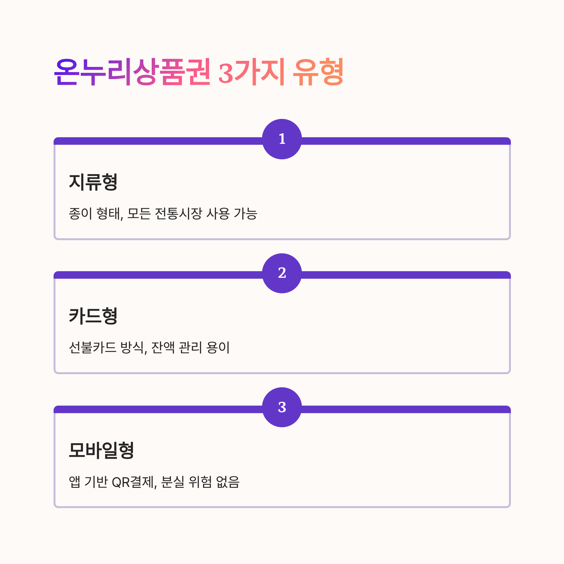 온누리상품권은 총 세 가지 유형으로 나뉘어요: 지류형, 카드형, 모바일형이에요. 각각의 상품권은 사용 방식, 편의성, 사용처에 차이가 있어서 나에게 맞는 유형을 선택하는 것이 중요해요.