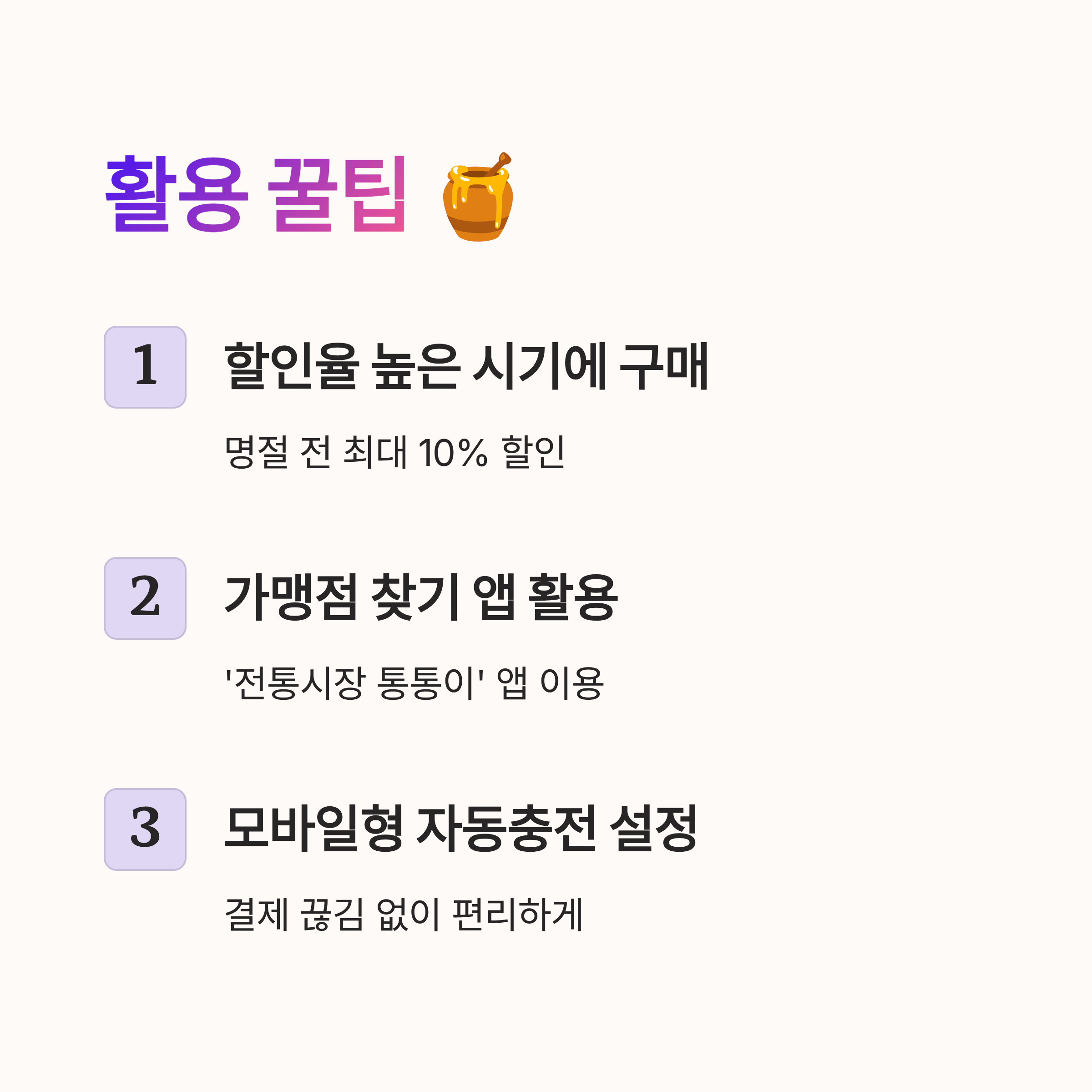 | 지류형 | 모든 전통시장에서 사용 가능 | 분실 시 재발급 불가, 잔돈 불가 | 현금 선호 사용자 |
